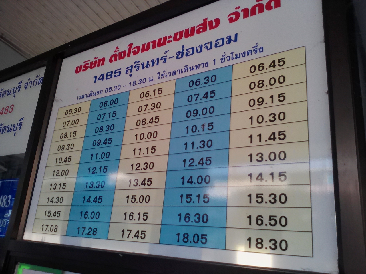 スリンバスターミナルからカンボジアとの国境の町「チョン・チョム(Chong Chom)」までロットゥー(乗合いワゴン)が出ています。出発時間は5:30〜18:30の間にほぼ15分間隔の1日50本(詳しい出発時間は写真を参照して下さい)。途中「プラサート(Prasat)」の町のバスターミナルに寄ります。チョン・チョムまでは所要約1時間20分、45B。