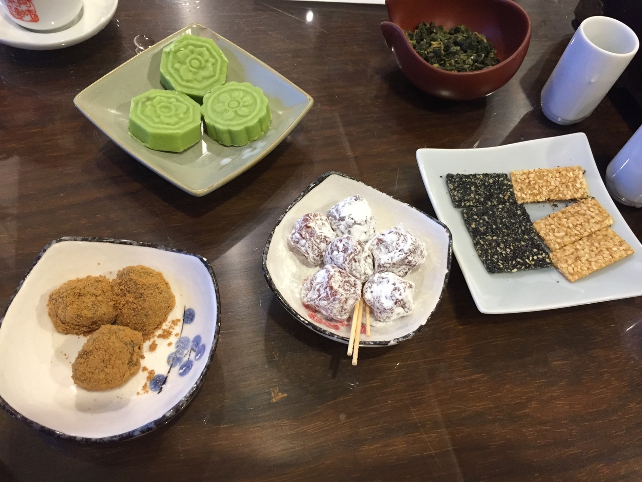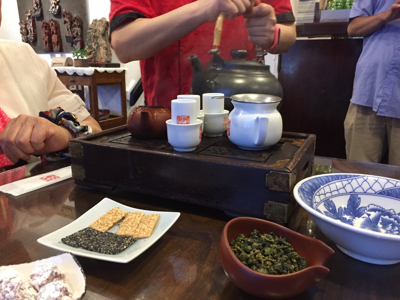 前回九份に来たときは団体ツアーで、自由時間があまりなく、お茶することができなかったので、今回は絶対行こうと決めてました。一人300元でお茶とお菓子のセットです。お茶の入れ方等はお店の人が教えてくれます。1回の茶葉で何度も何度も飲めるので、かなり長居してしまいました。余った茶葉は袋をもらって持ち帰ることができます。ポストカードも一人1枚ずつもらえました。
