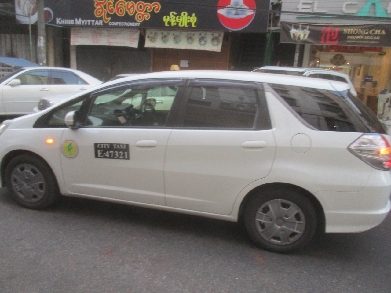 ヤンゴン滞在中に利用する交通機関です。白い車体が多く、黒い車体のタクシーにも乗車しました。車体の色よりナンバーの色の方が分かりやすく、赤色に白抜きがタクシーでした。メーターを利用することはなく、運賃は運転手の言い値でした。