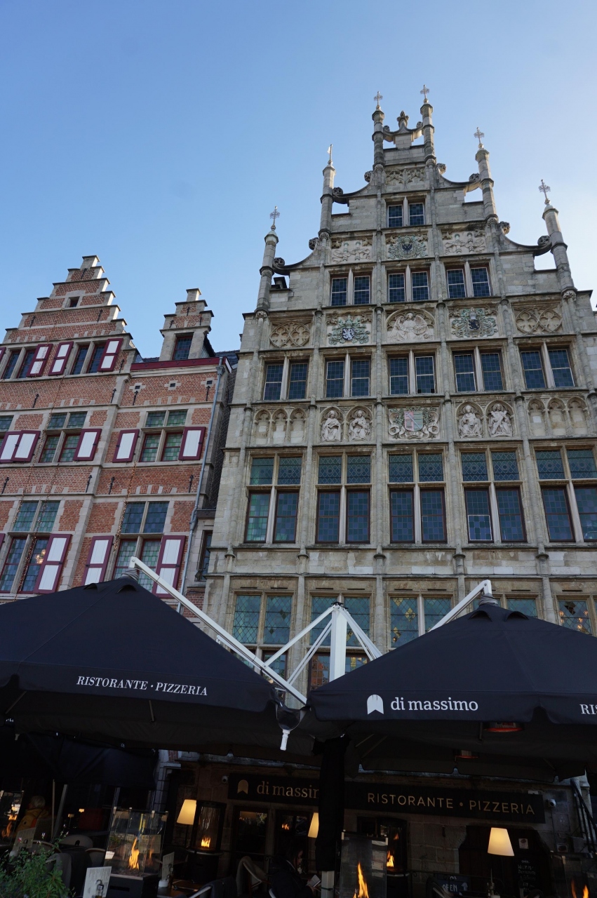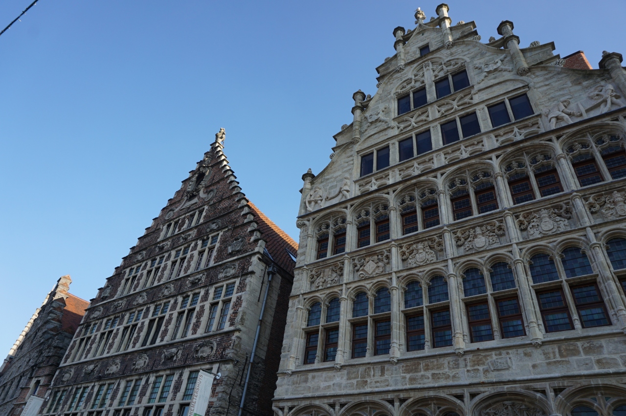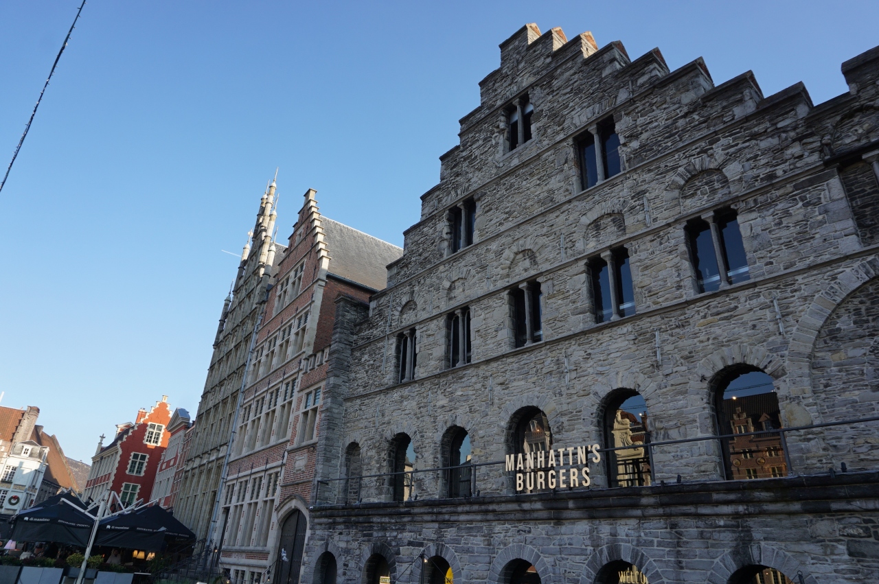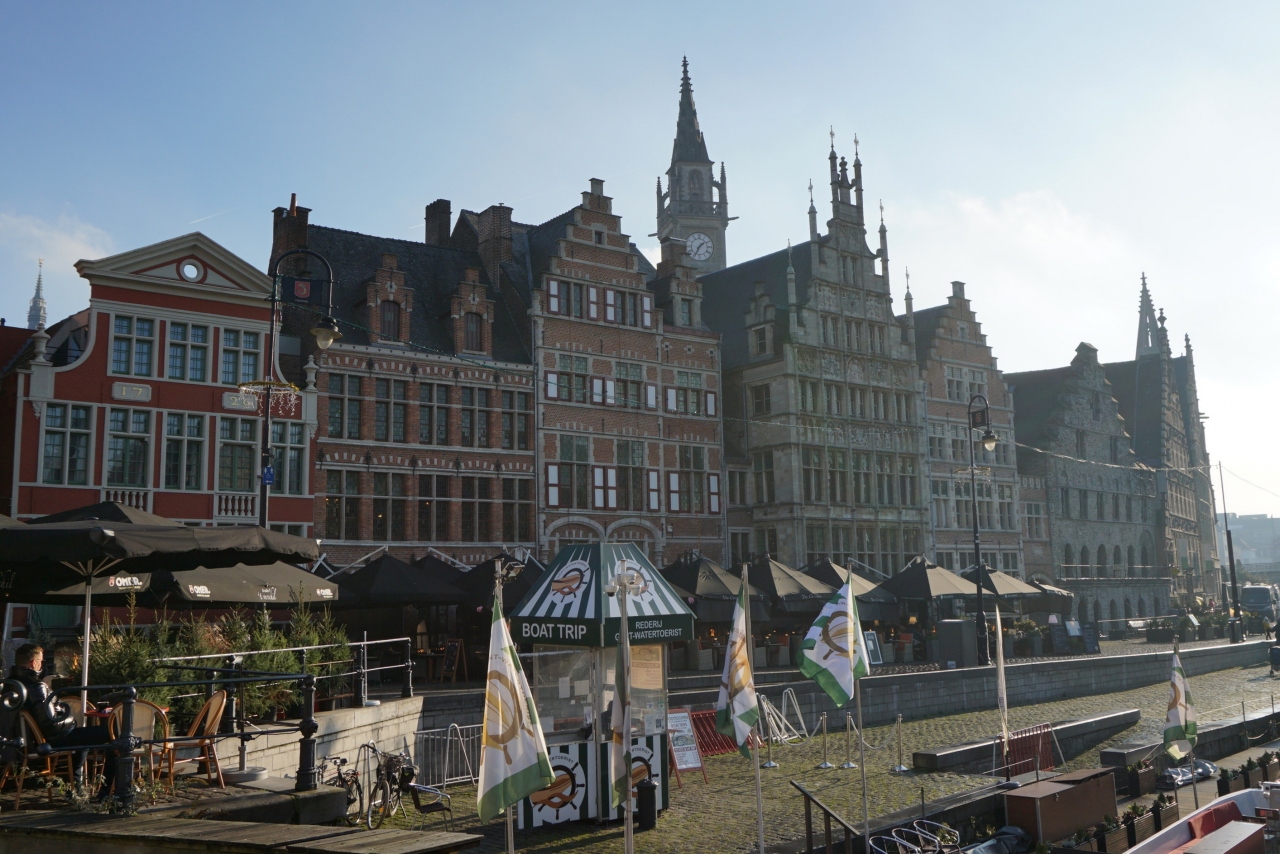 レイエ川沿いに見ごたえあるギルドハウス並ぶエリア、コーレンレイを眺めながら食事ができます