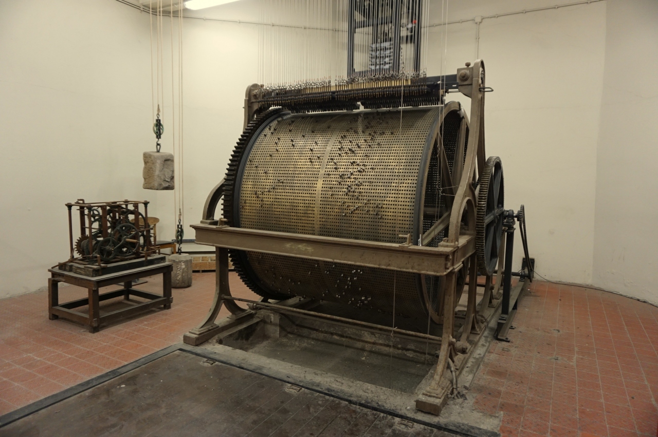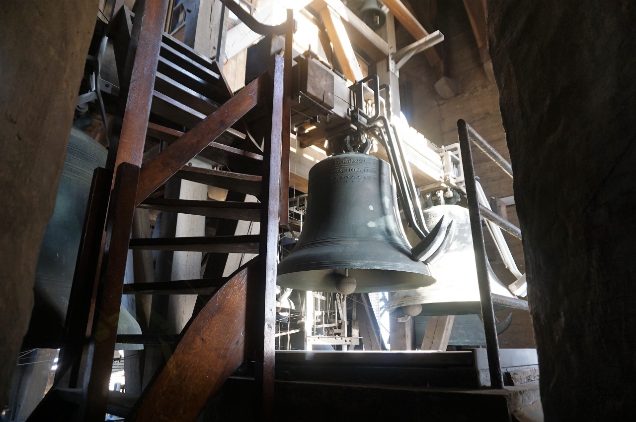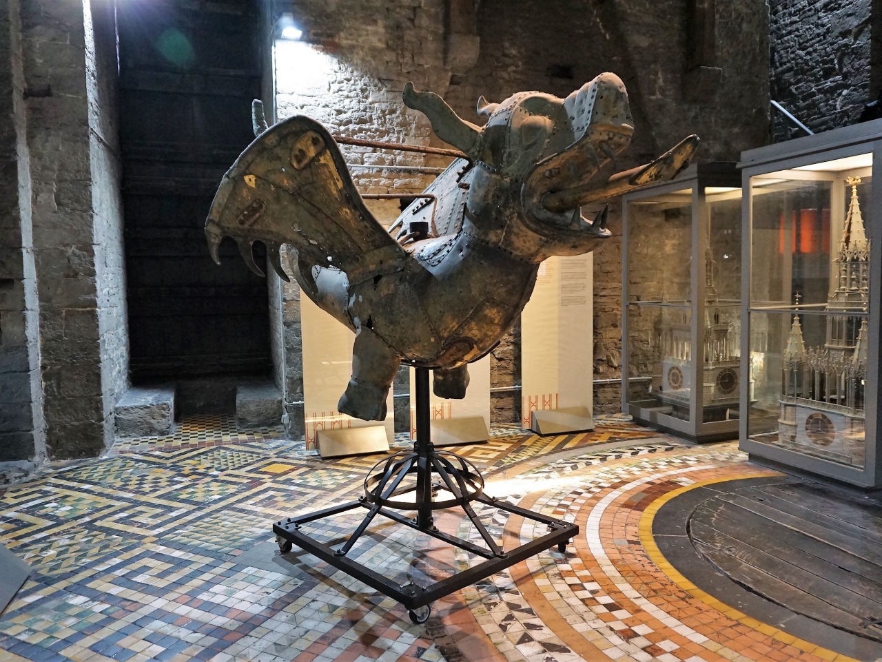 塔内部には、塔のてっぺんに飾られている少しユーモラスなドラゴン、カリヨンの鐘が展示されていました。