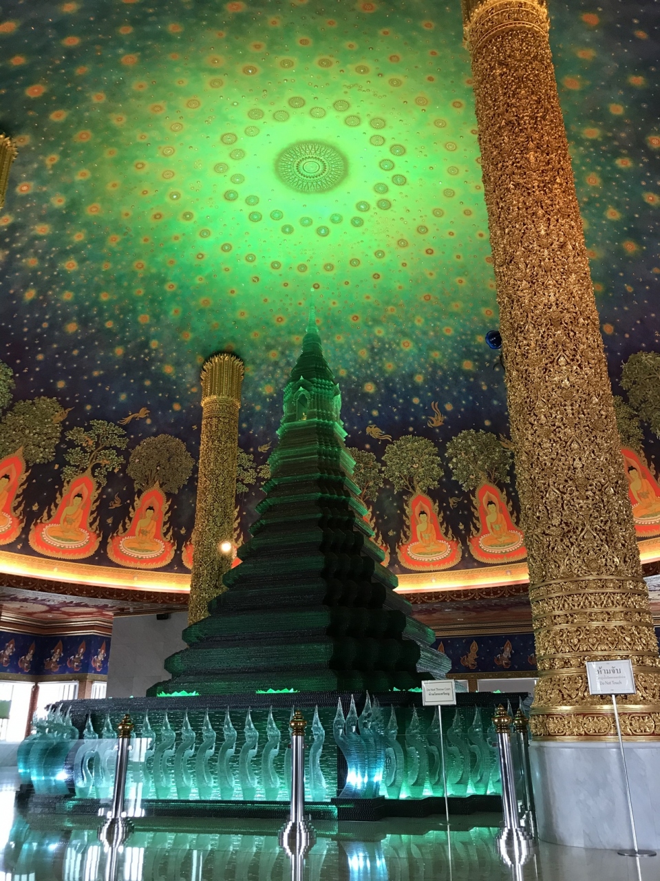 メトロとソンテウで行くのが楽です。タラートプルーのバイクタクシー乗り場(駅前)で待ってると赤いソンテウが来ます。もれなくワットパークナムまで行くので大丈夫ですが、(窓に日本語でワットパクナムと書いてあるのもある)運転手さんに一言「ワットパークナム?」と確認するとよいでしょう。8バーツで入口まで行けます。別の駅から徒歩で行く方法もありますが、こちらのほうが断然楽です。帰りは近くのセブンイレブン横のソンテウ待機場所から乗れます。BTSに乗りたいというと、周りの人も教えてくれるので大丈夫です。お寺は思ってたより豪華でキレイです。平日に行くとエレベーターが止まってるので、階段で行きましょう。