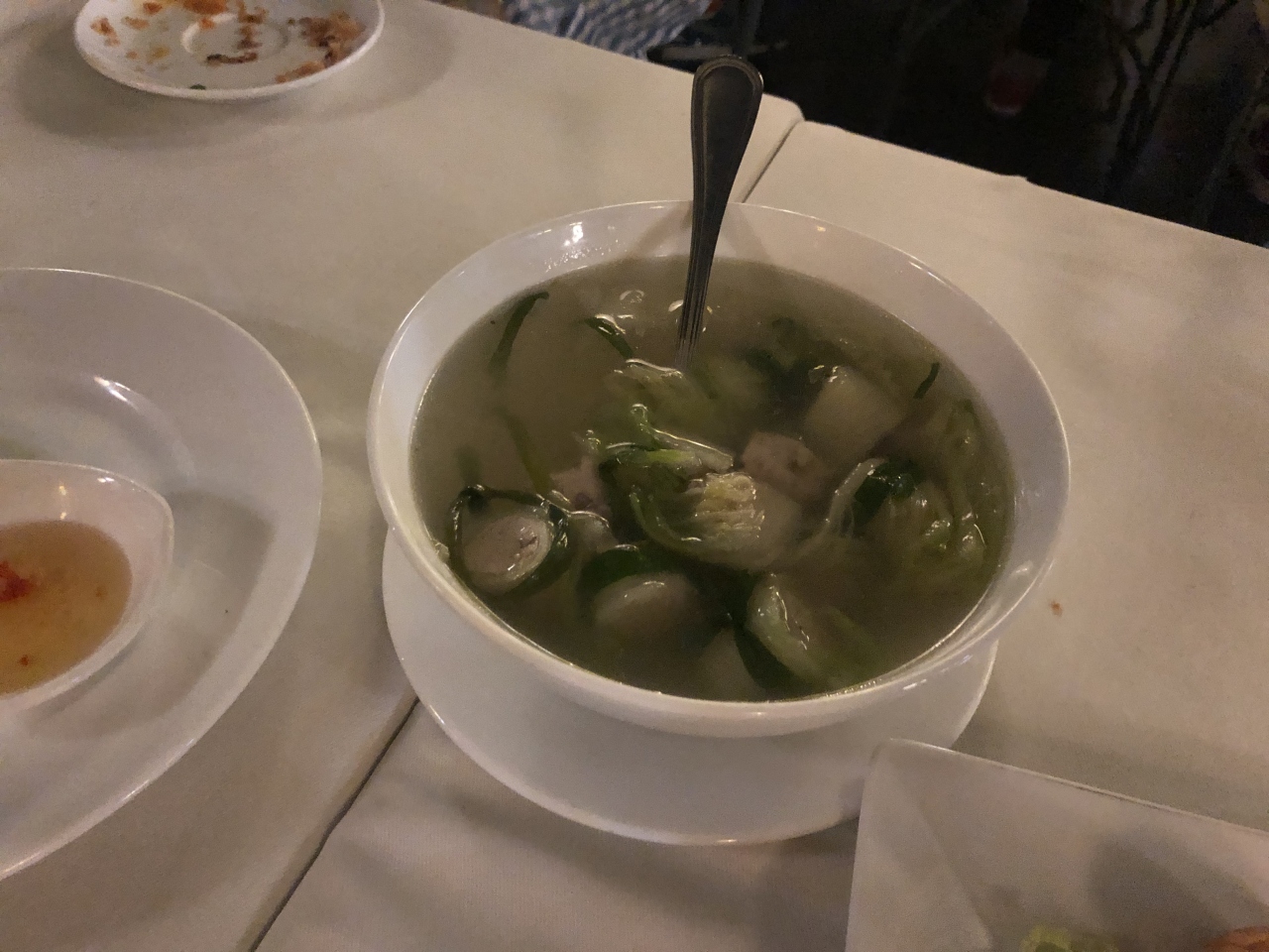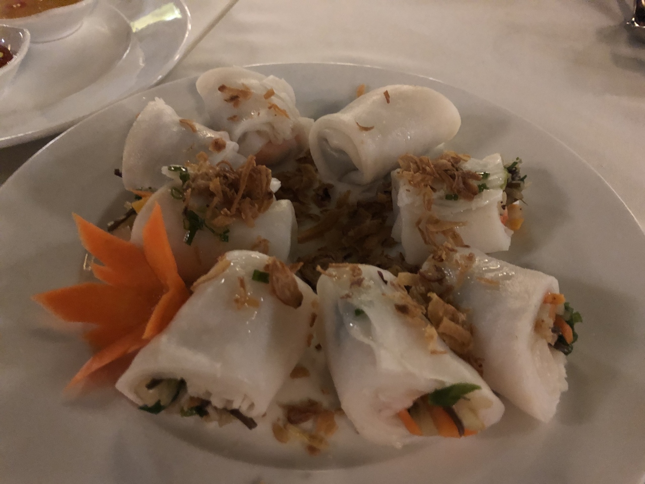 ツアーディナーで訪問しました。3年前に次いで2度目です。川のほとりのレストランで、ランタンが下がっており、ほの暗い雰囲気です。ベトナム料理が次々に出て来ます。素朴な味付けで美味しいです。茄子と鶏ひき肉の土鍋煮が好きです。