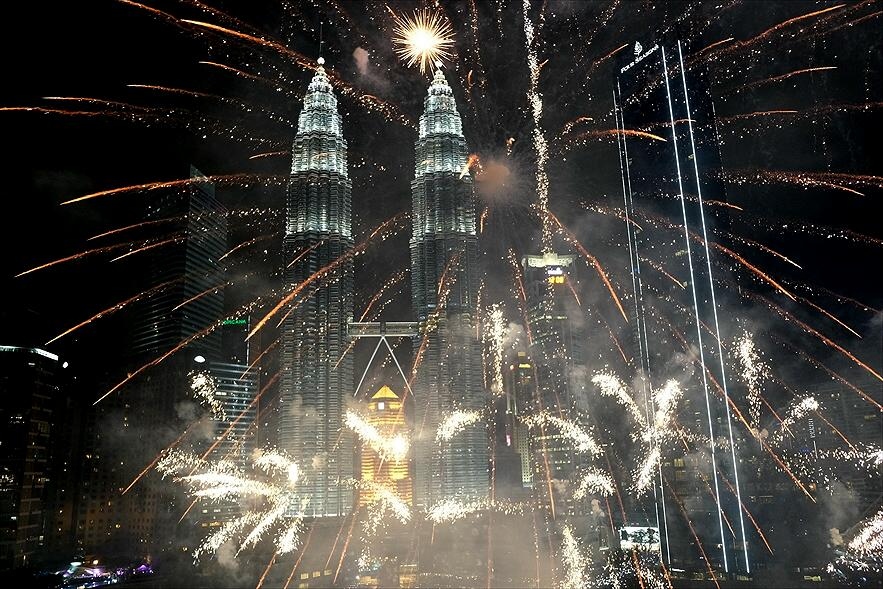 ツインタワーや周辺の高層ビル群を彩る花火が見事!