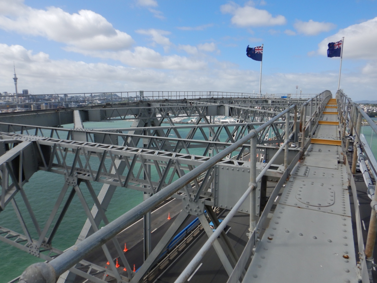 一度やってみたかったブリッジクライム。オークランドでそのチャンスがありました。ハーバーブリッジのオークランド市内側のたもとにある建物で用意されているオーバーオールに着かえ、ハーネスとヘルメットを装着。荷物はスマホさえ持っていけないのでロッカーへ(ガイドが撮ってくれた高い写真を購入しないと証拠写真残りません)。