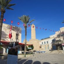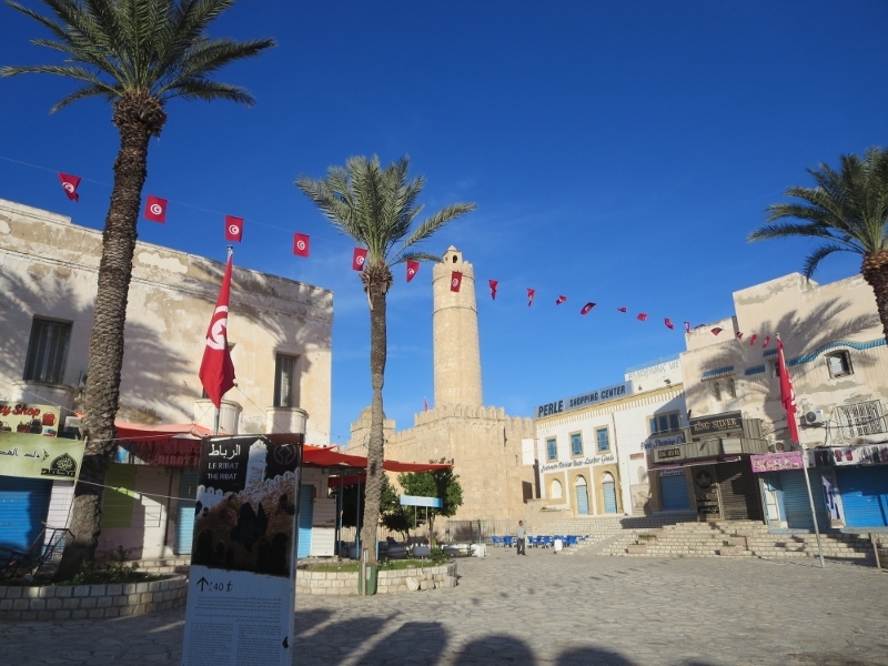 スースの街並みが良く見えると聞いたので登ってみました。料金を払って中に入ると、モスクのように中庭がありました。周りに説明書きもありました。階段を登って一番上に行くと、街全体を見渡すことができました。旧市街が城壁で囲まれていることがよくわかりました。
