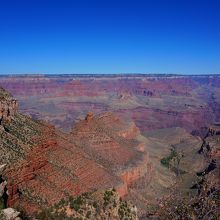グランドキャニオンにはいくつかの展望ポイントがあり、その中でも有名なブライトエンジェルポイントを訪れました。ブライトエンジェルポイントにはお土産屋さんもあり、その建物を通り抜けていくとすぐにグランドキャニオンの絶景が見られました。