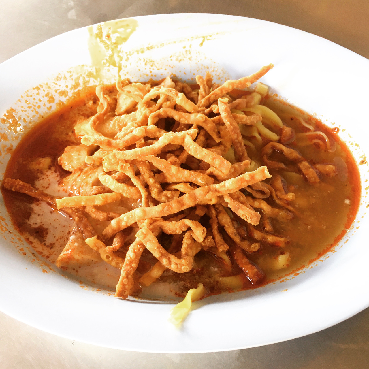 カオソイムーにした。ライムを絞ってからいただく。コクのある辛めのスープがとてもよく合う。箸休めに辛めの高菜漬けと、お口直しのシャロットをかじりながら、一気にいただく。これが40バーツなら、大満足だ。