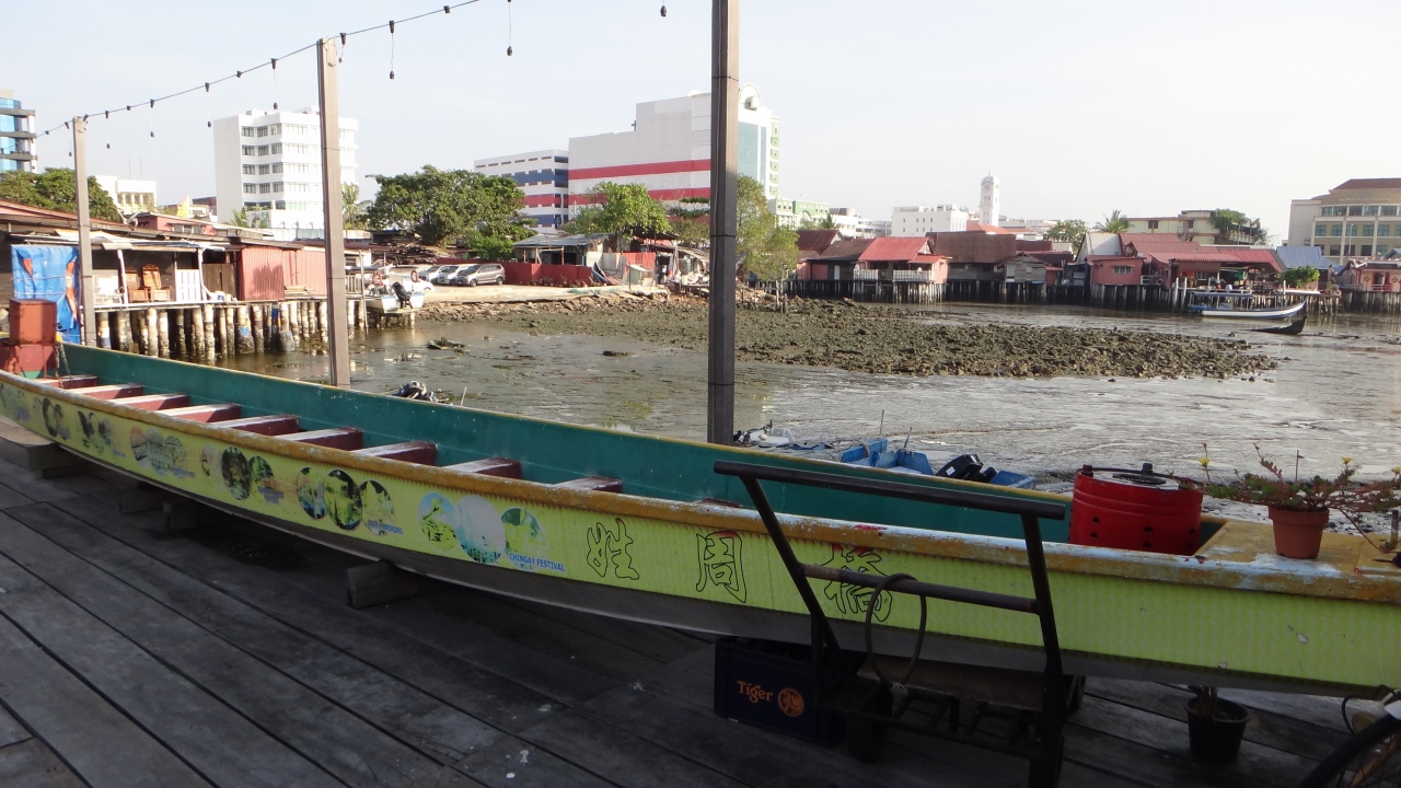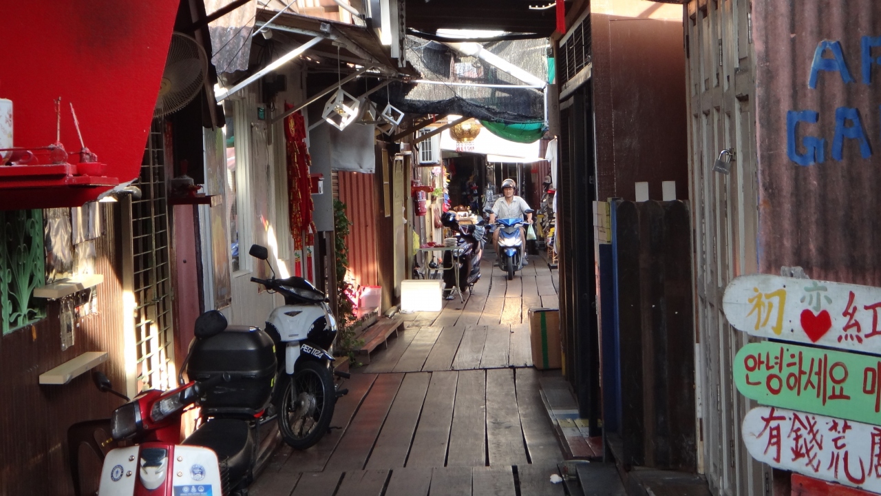 海岸へ向かって長い桟橋の両脇に、多くの商店・住まいがある。一族の集合体か。朝早く訪れたので、空いている店は少なかった。周一族の橋の他に、陳一族の橋・李一族の橋もあるそうだ。先端付近は船乗り場になっている。
