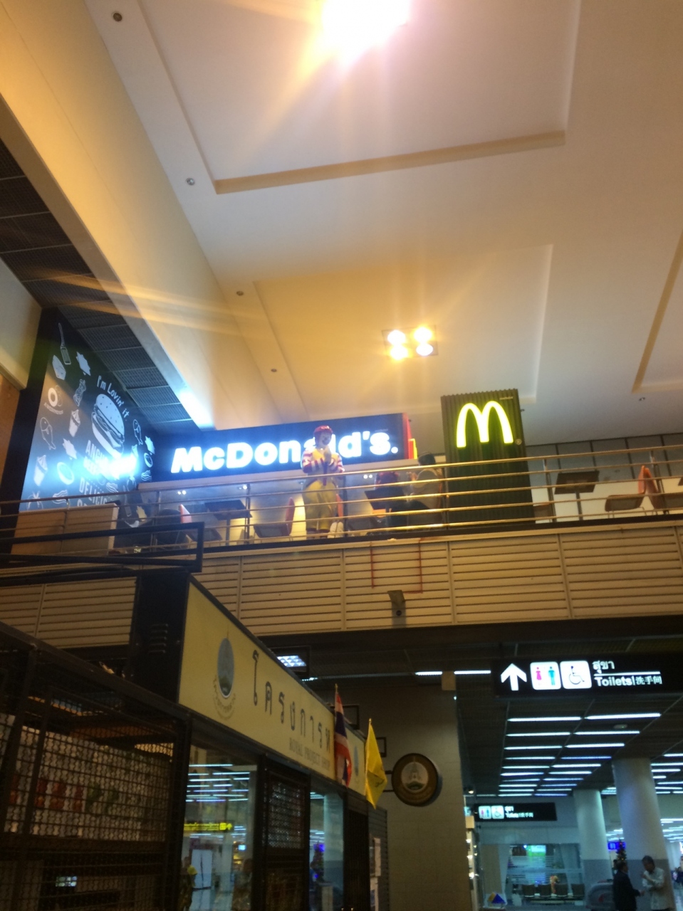 マックは世界中どこでもあります。小腹がすいたのと、辛いタイの料理をもう食べたくなかったので、テイクアウトでコーヒーとハンバーガーを買いました。タイのナマステ~という挨拶ポーズのドナルドがいて、楽しかったです。
