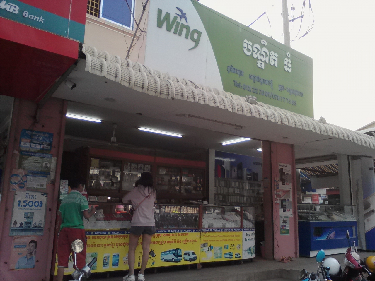 付近に携帯ショップがいくつかありますが、この登録されているショップは交差点の南東角の店です。看板に“Bros Thom”の文字はなくクメール語のみ。なので何と書いてあるかは不明です。写真の看板を参考にして下さい。日本語のかなり堪能な奥さんがおりいろいろ聞けます。SIMカードは3ドル、5ギガ分のチャージが3ドルです。バスチケットの取扱いはなくなりました。