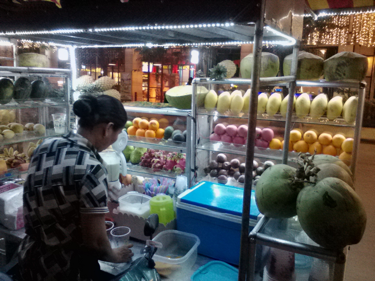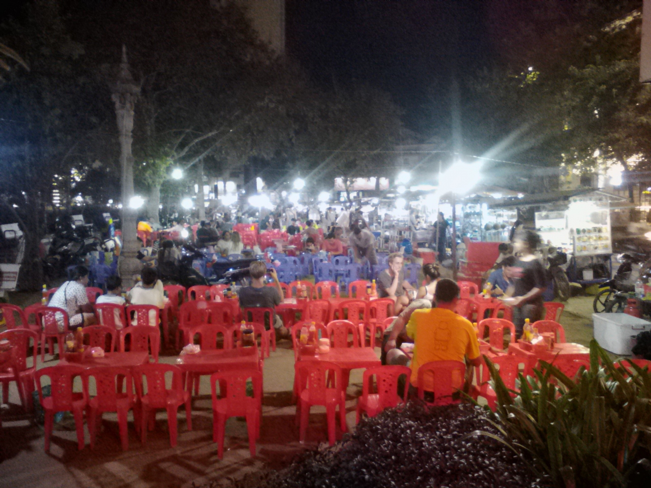 ポカンボール通りの西の端(オールドマーケット〜ナーガ像のあるロータリー)は夕方から屋台が並びます。一品料理から簡単なフライドライス、フライドヌードルや麺類、串物、スイーツ、フルーツジュースなど種類も多いです。シェムリアップ川との間の公園部分にイスとテーブルが置かれているので買ったものはその場で食べられます。夜風に当たりながらの食事は気持ちいいです。
