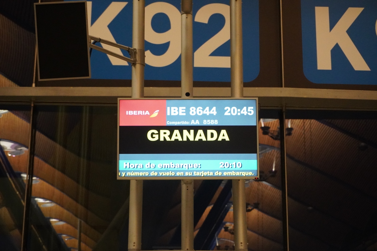 成田からマドリードに国際線で到着しました。国内線に乗り換えてグラナダに行くために、電車のような乗り物で移動します。ホームにはピカソの壁画がありなかなか芸術的でした。国内線の待合スペースには、自動販売機があり水とジュースを買いました。小銭が使えお釣りも出ました。