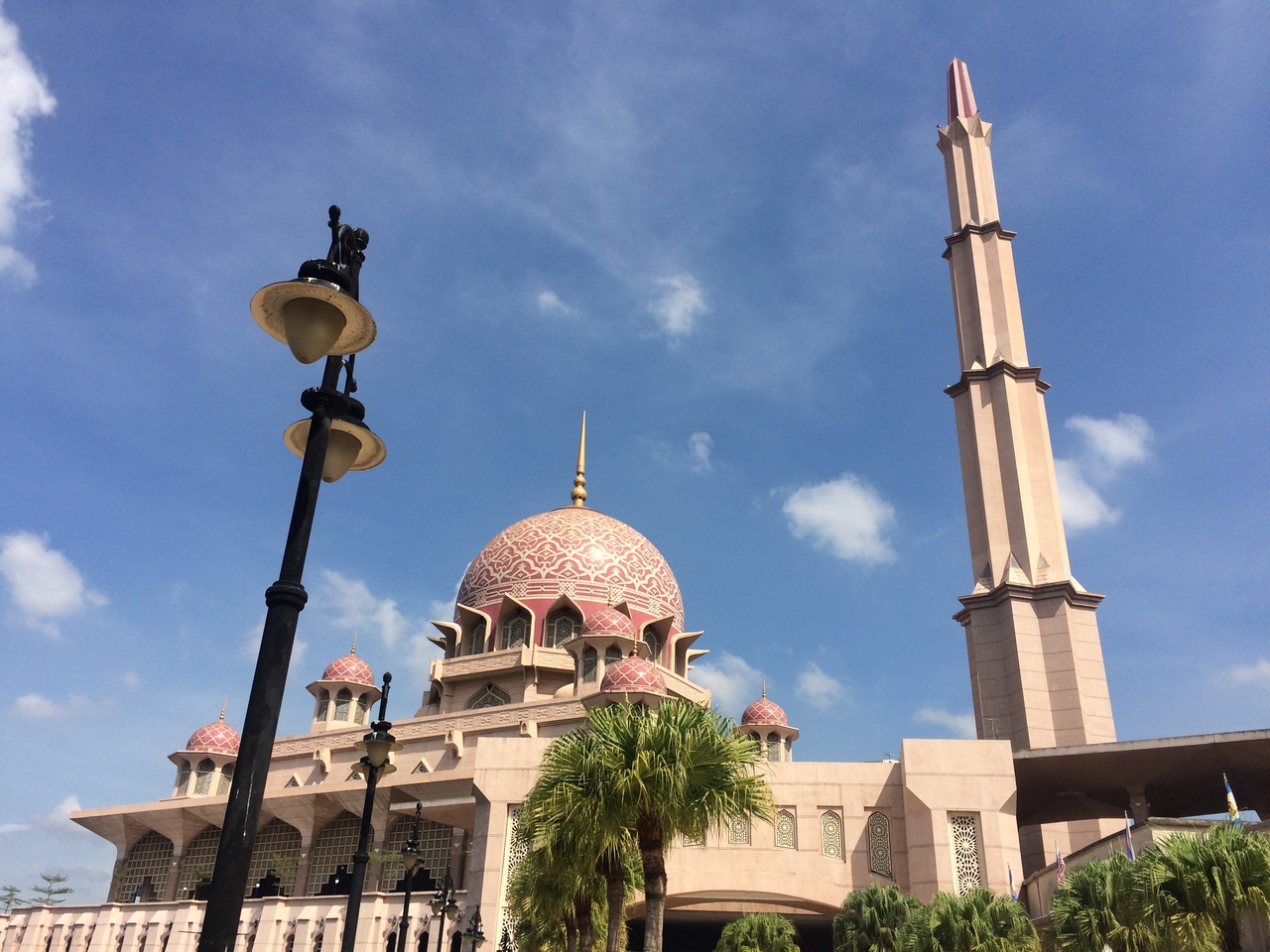 プトラ モスクは別名がピンクモスクで、妻が絶対何が何でも行きたい場所だったので、KLIAエクスプレスと、市内バスを利用して着きました。川沿いでピンクの真ん丸屋根が見えた時は感動しました。男性は、何も必要なく入れました。
