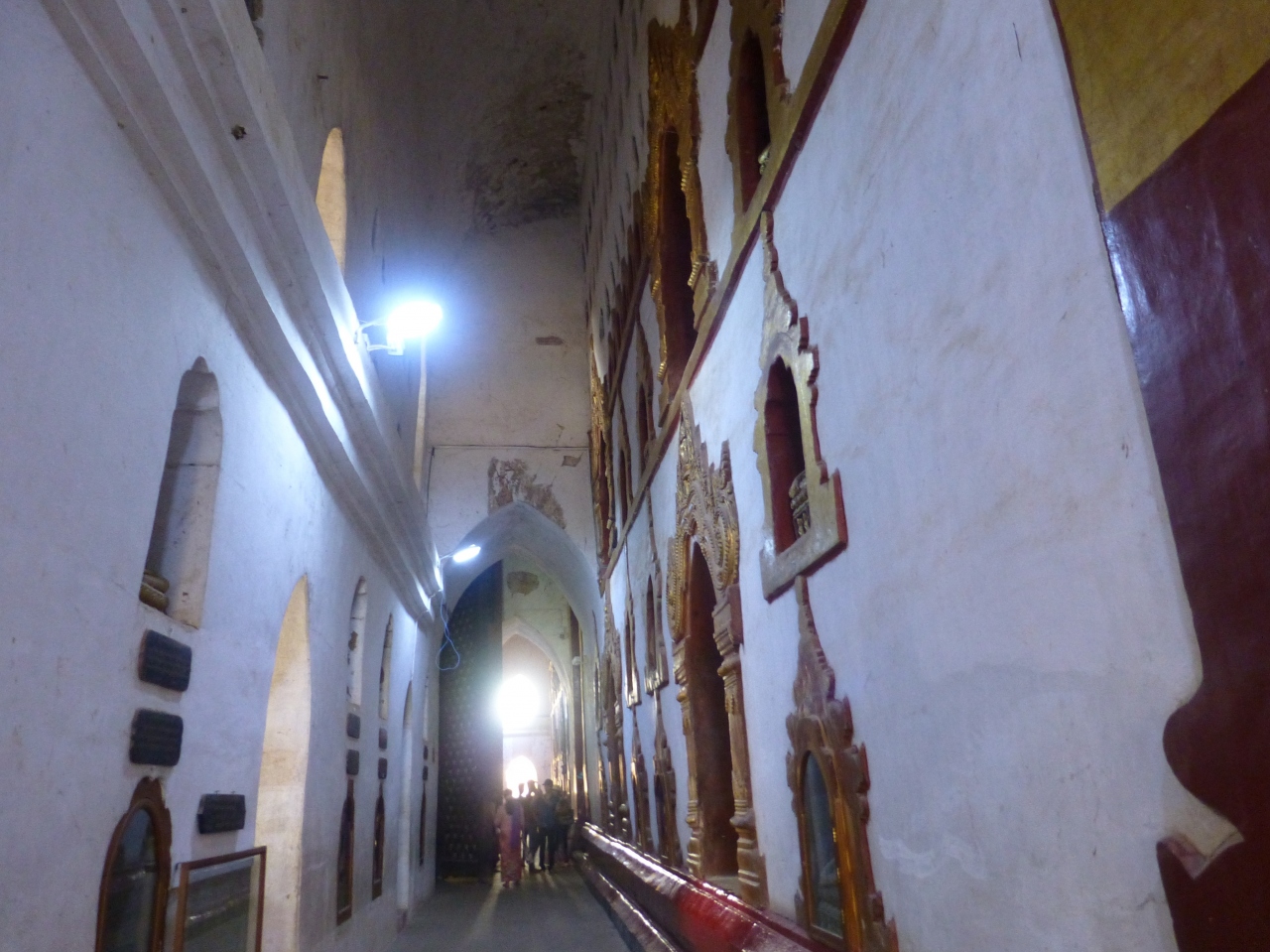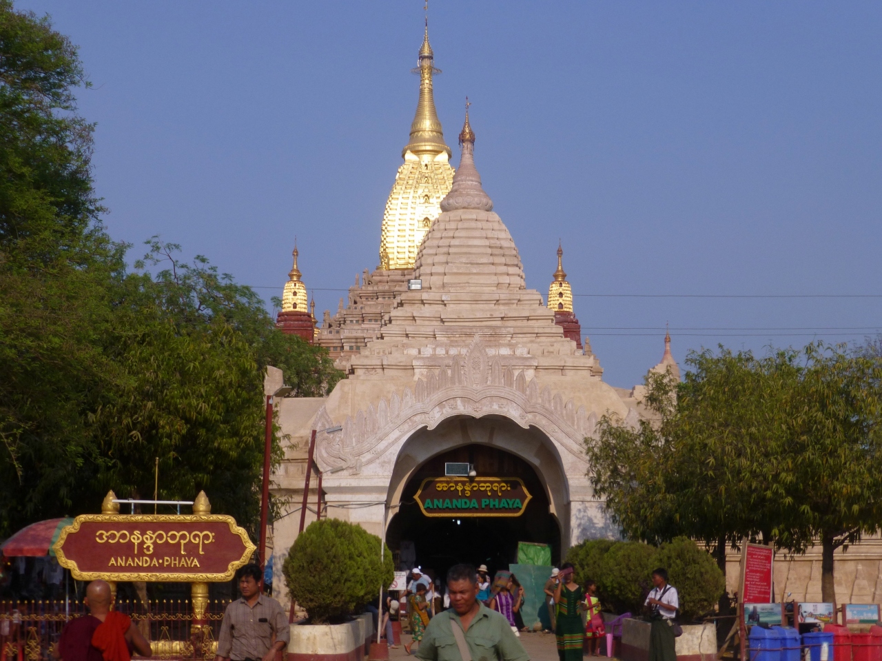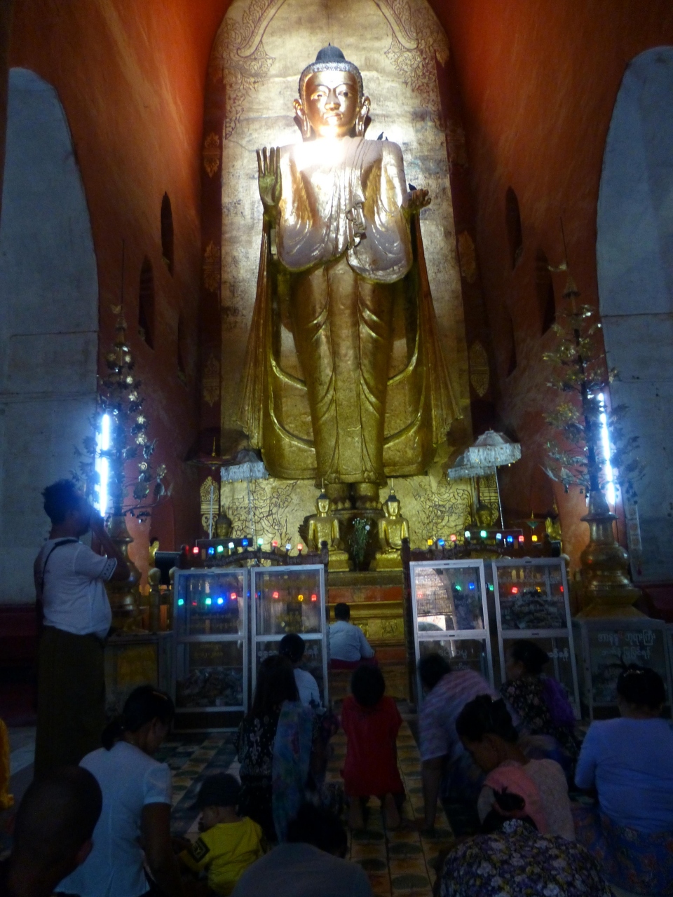 バガンについてまず行きました。ホテルからは車を手配現地まで。行きがてらまず金色の寺院屋根の先が光っているのが目にはいりました。土産物屋の並ぶ敷地は広かったです。中にはいり回廊を巡りながら噂とおりの大きな4つの像に圧倒されながらみてまわりました。