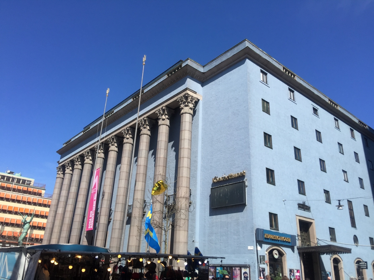 コンサート開催日ではなかったので中には入れませんでした。外に階段があるのですが、皆さんそこで日向ぼっこをいています。目の間は青空市場のフュートリエットが営業しています。ホール内部の見学ツアーは夏の間ノーベルツアーというのをやっています。