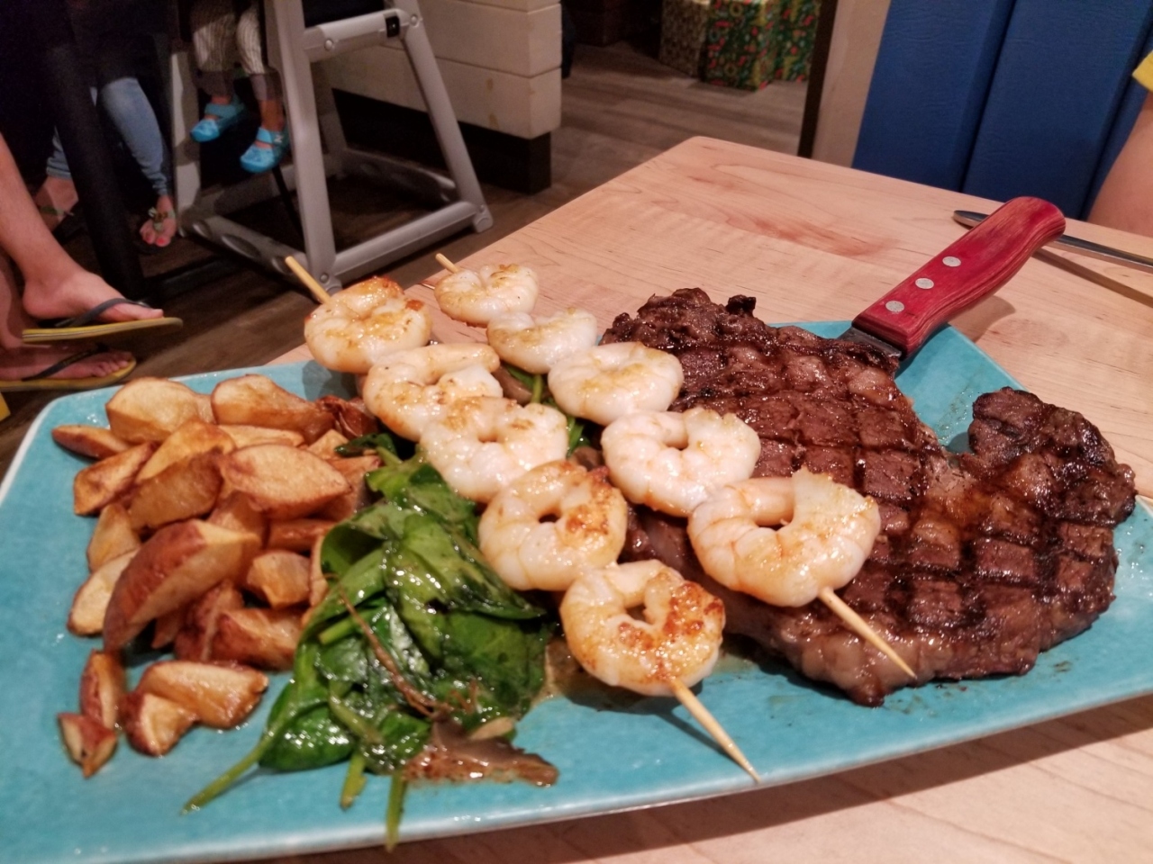 牛とエビのグリル、ドリンクで65ドルほどと安くはありません。