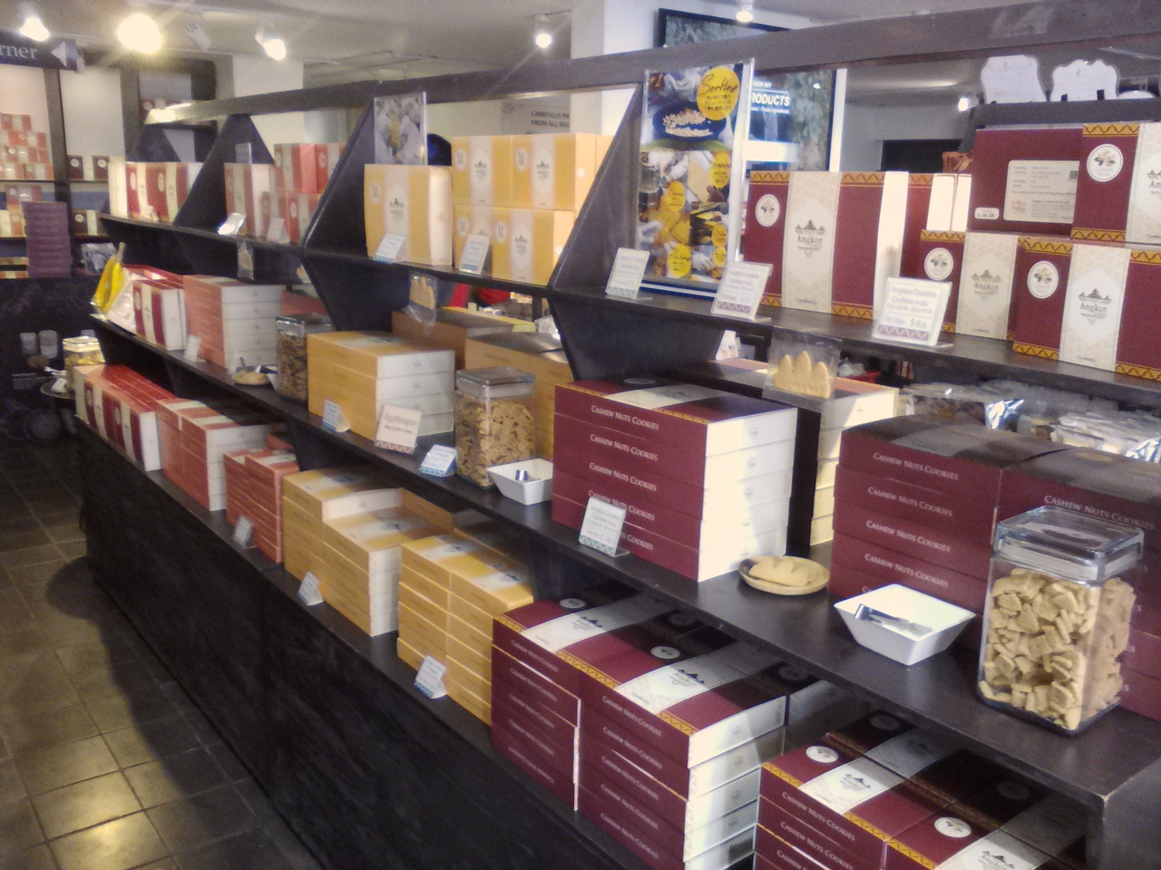 看板商品のクッキーですがアンコールワットの形をしており、お土産にはもってこいです。バラマキにも見事に対応しています。お味は3種類、「カシューナッツ」「パイナップル」「バナナシナモン」。どれも試食ができるのでお好みの物を買えます。お値段は10枚入りが6.6ドル、20枚入りが11ドル、30枚入りが16.5ドルです。同じサイズの物を5個買うと1個おまけでもらえます。日本の観光地とほぼ同じ値段なので日本人観光客にとっては違和感なく買えると思います…。