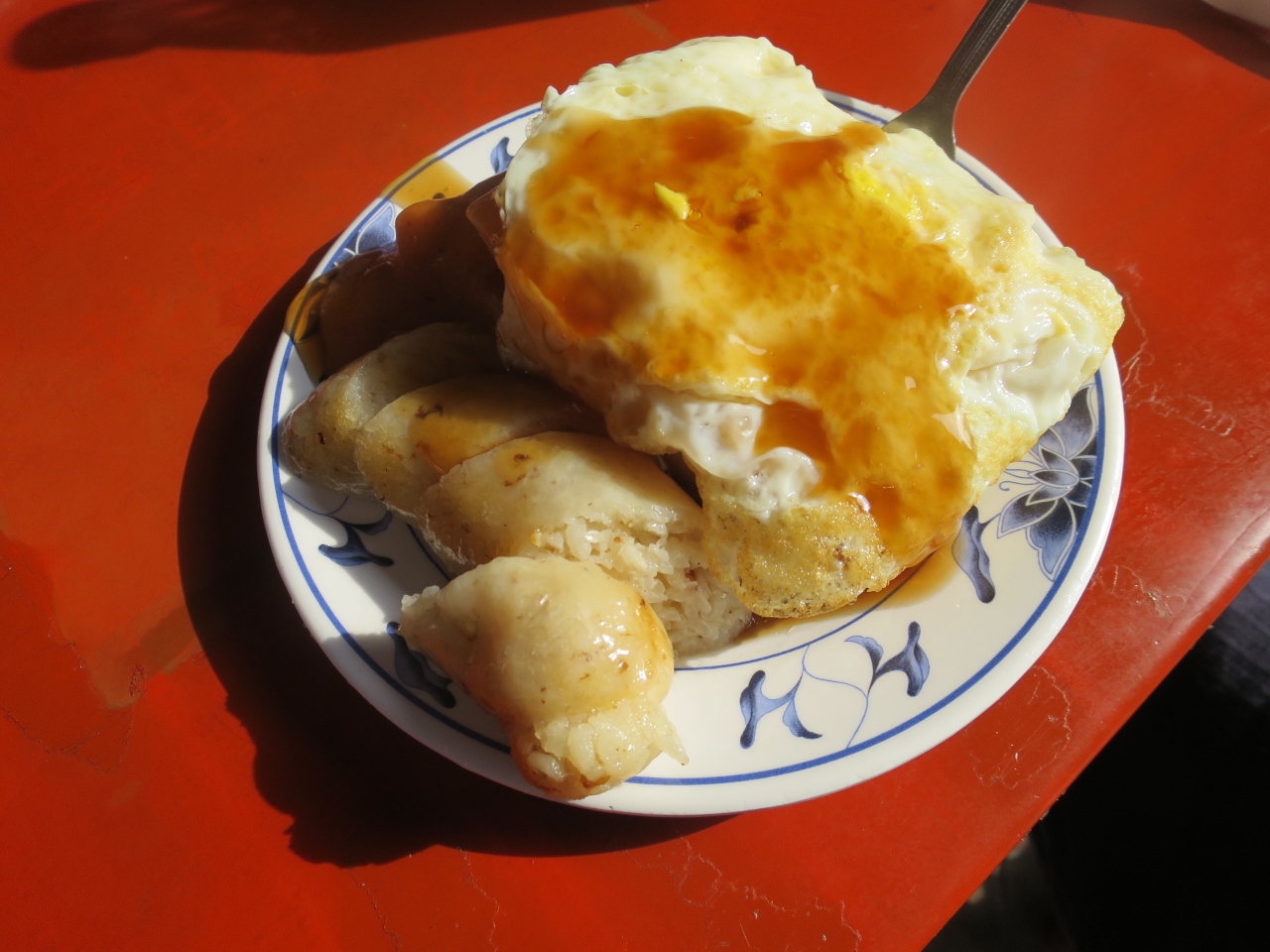 大根餅、もち米の腸詰、目玉焼きの三点セットが有名で。早朝からボリュームたっぷりで、お腹いっぱいになりました。