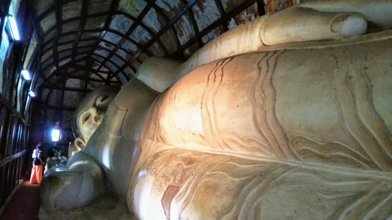 建物の中に全長18メートル(日本語ガイドブックによる)の寝仏(リクライニング・ブッダ)が窮屈そうに横たわっている。