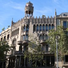 カサ・リェオ・イ・モレラからカサ・バトリョまでの一画は、お互いに競い合うようにモデルニスモ建築が並んでいて、グラシア通りのハイライトスポットになっています。カサ・リェオ・イ・モレラは、ガウディのライバルだったムンタネーの作品ですが、ここにもムンタネーを特徴づける、花の彫刻付きのピンクの柱がありました。ぱっと目を引く王冠付きの塔も、花々で飾り付けられていました。中には素敵なステンドグラスが残されているそうですが、今は見学できなくなり、とても残念です。
