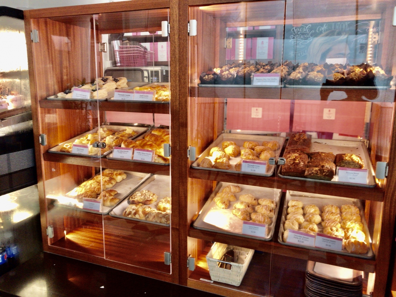 ケースにはホテルの宿泊者へサービスされる人気のバナナブレッドや「サーフラナイ 」の朝食で提供されるクロワッサン、甘い系のデニッシュやマフィン、しょっぱい系のお惣菜パンが10種類以上並んでいました。