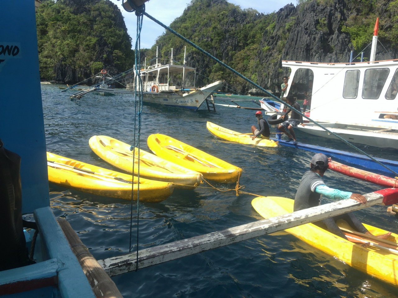 ツアーの途中でビッグラグーンを訪れました。カヤックに乗って湾の奥の方に行けます。波が無い分、海の透明度が高く、だいぶ深い底の方まで見えます。向こうからも良く見えるせいなのか、熱帯魚はあまり泳いでいなかったです。