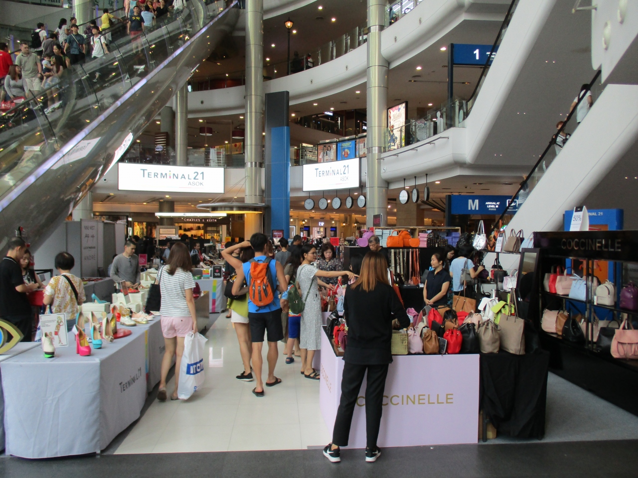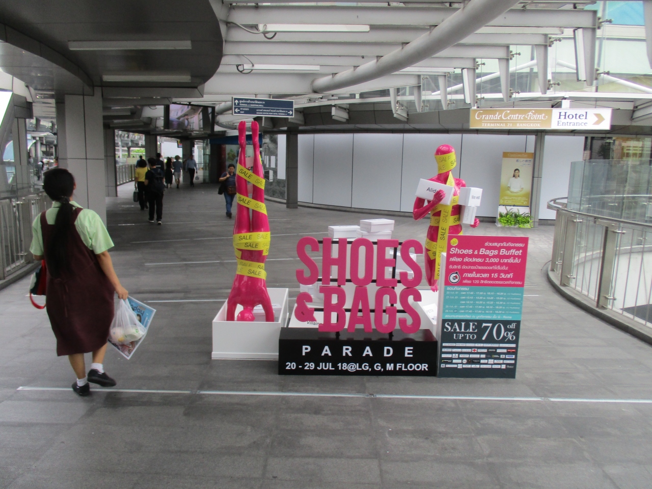 アソーク駅を下車するとスカイウォークにターミナル21の広告を行っているので、今回の企画展やセール内容が分かります。単純な広告看板だけでなく、立体的な要素がある斬新な広告を行っているので、ふらっとお店に入ってしまいます。7月は靴のセールイベントを開催しており、意外と品質の良い商品がありました。