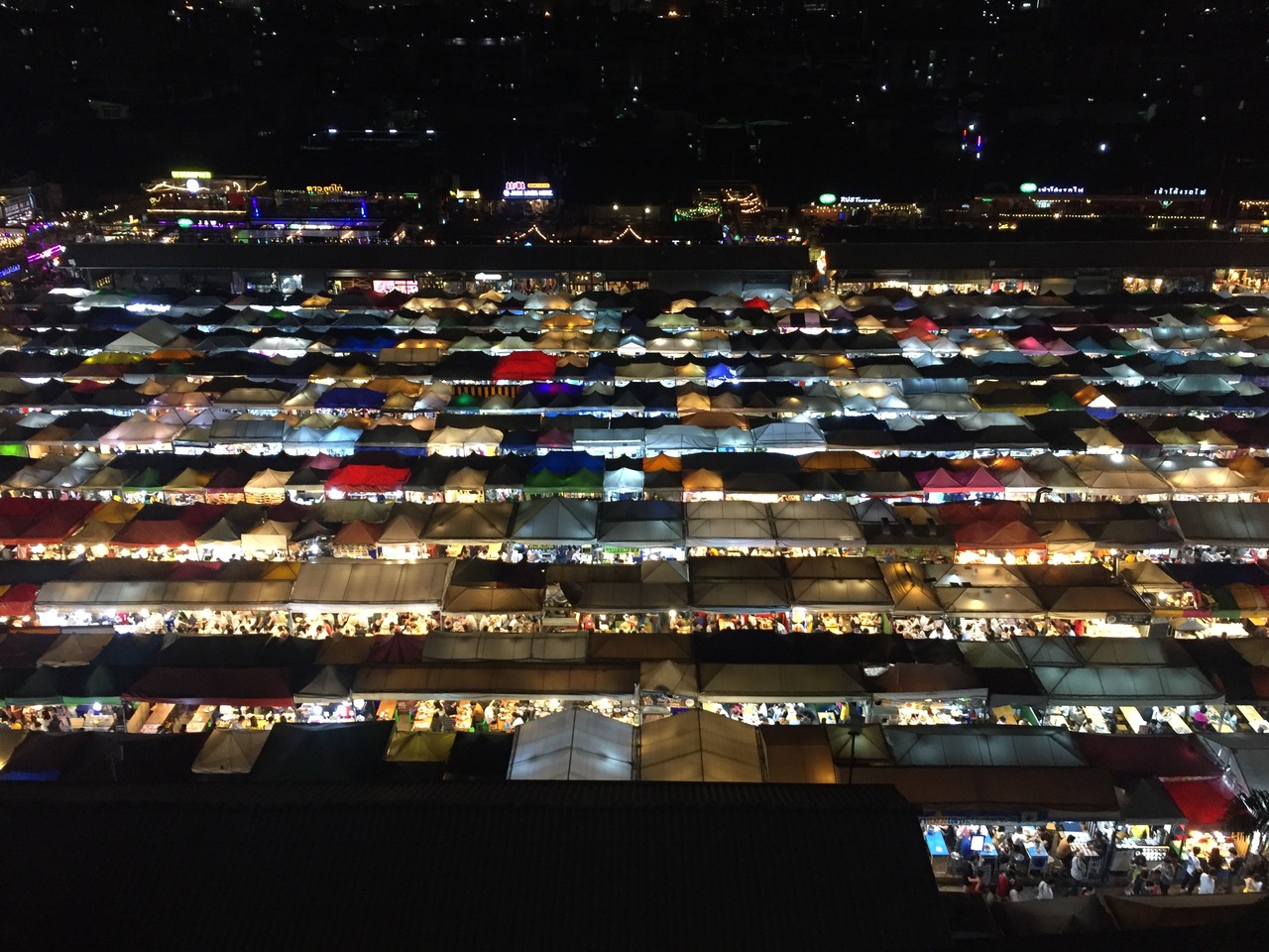 市場の隣のエスプラネードというショッピングセンターの駐車場から、この宝石箱のような景色を見ることができます。このスポットにたどり着くまでに少し迷いましたが、近づいてくると人がたくさんいるのですぐ分かると思います。市場の方は激混みだし暑いしで、長居できませんでした。名前を刻印してくれる革のパスポートケースが70バーツで5個買うと一個オマケだったので、それだけ買ってすぐ帰りました。