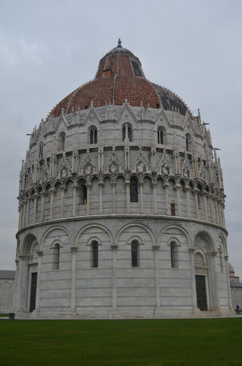 大聖堂の前にある建物です。キリスト教のことはよく知りませんが、洗礼は教会内の水盤のようなところで行うのかと思っていました。洗礼堂が独立してあるというのは数からしたら少ないように思いますが、ピサの洗礼堂は細かい彫刻がなされてとても豪華でした。