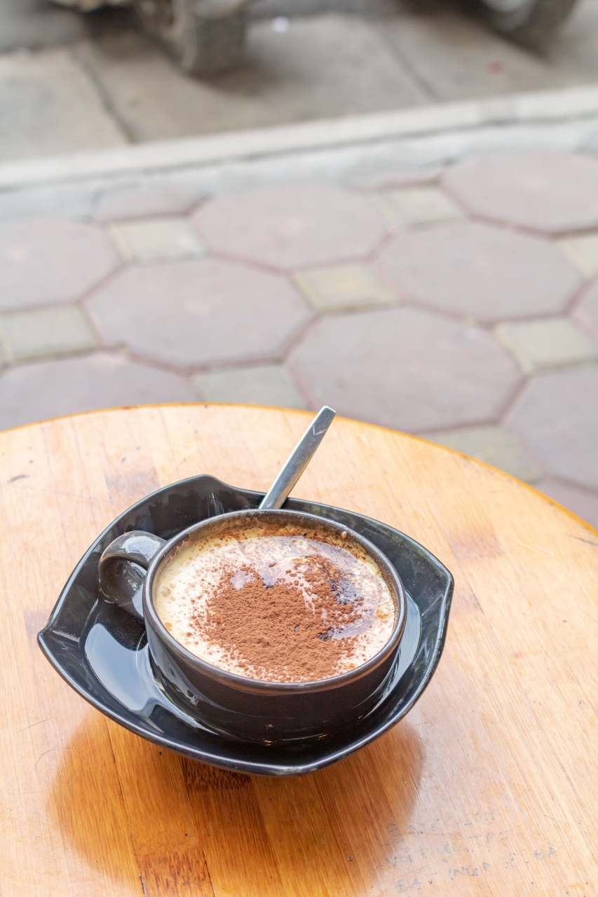 頂くのは定番のベトナムコーヒーではなく、ハノイ名物「エッグ・コーヒー」。名前のとおりコーヒーに卵黄、練乳、砂糖を混ぜて作るベトナムの伝統飲料で、コーヒーを飲んでるというよりはティラミスやプリンを飲んでるような感覚。飲んでるのに喉が渇くという不思議な飲み物。ドリンクというよりはスイーツ感覚で味わった方がよさそう。