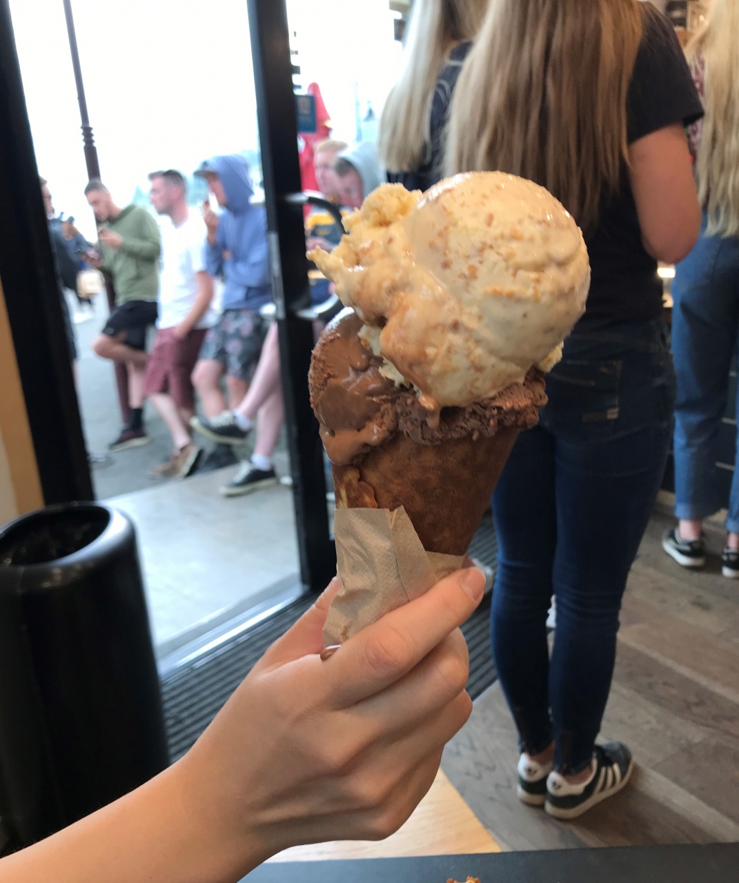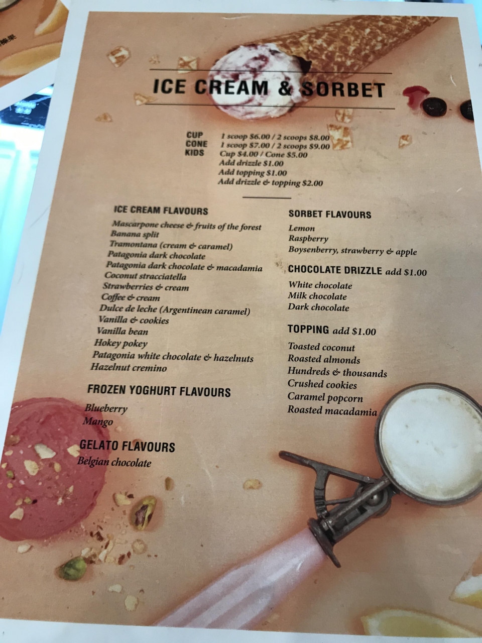 アイスクリームは、カップとコーンで値段が違い、コーンの方が1NZD高いです。コーンの2スクープ(9NZD)を注文しました。最初に注文して商品を受け取った後、最後に会計をするシステムでした。