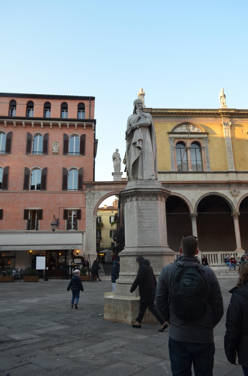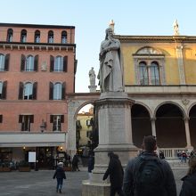 エルベ広場から少し入ったところですが、それだけでもずいぶんの人が少なくなり、ずいぶん落ち着いた雰囲気になります。土産物の店もありません。真ん中にはダンテ像、スカラ家の屋敷などの建物が並ぶとても美しい広場です。