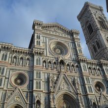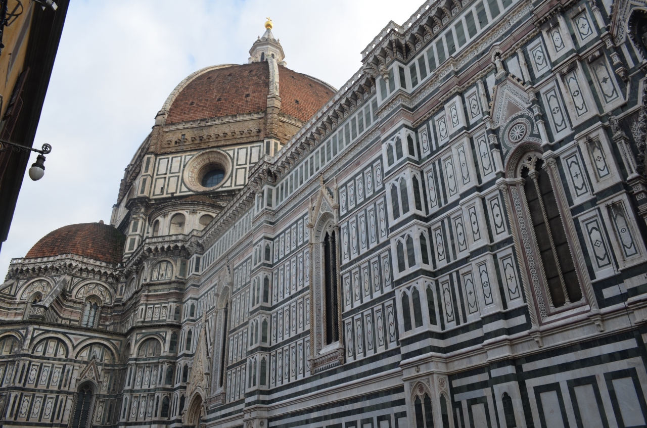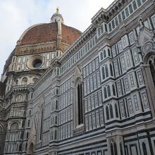 使われている石が緑、ピンク、白ととてもカラフルなのには驚きました。こんなに色とりどりの教会って初めて見ました。ただ、近くから見ると巨大すぎて、一部しか見えません。正面から見るとファサードだけで、クーポラの部分はほとんど見えませんでした。