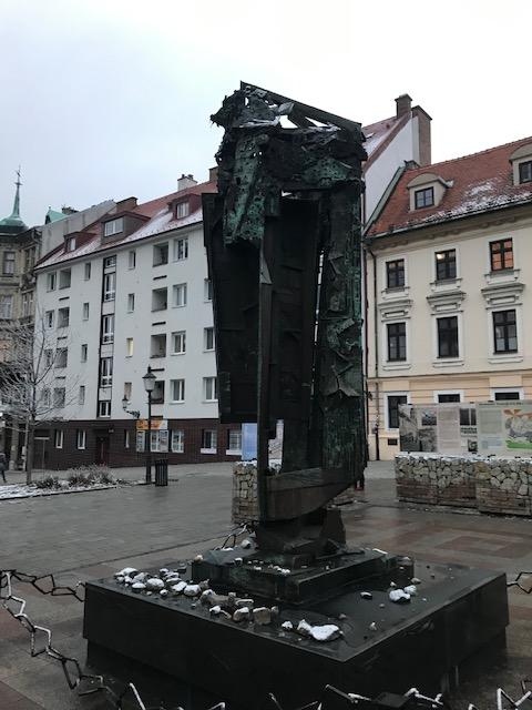ブラチスラヴァの旧市街の中心のフラヴネー広場からスロヴァキア国立劇場があるフヴィエズドスラヴォヴォ広場に移動しました。フヴィエズドスラヴォヴォ広場を進んで行くと西の端にペストの終焉を記念して建てられた聖三位一体の碑があります。その先にこのホロコースト・メモリアルがあり、聖マルティン大聖堂のすぐ前です。メモリアルの周りには説明書きがあって、悲劇について書かれています。