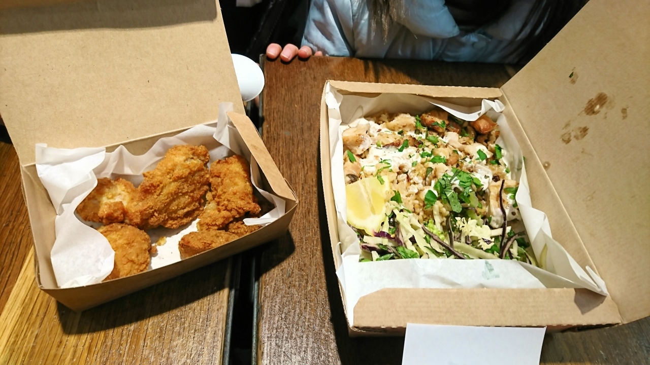 ユーストン駅の2階にあるカフェレオン。リーズナブルな価格帯で店内でも食べることができるお店。イングランドでは珍しく、無料のお水が置かれているので助かる。お水はレモン水だ。関が多くはないので誰かが席を確保して並んでおいたほうが無難。