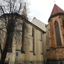 ブラチスラヴァのトラムが走る大通りのNámestie SNPという通りから南へ旧市街の方へ少し入った場所にあった教会です。特に面白く感じたのは礼拝堂で多角形をしていて他にはみられない形をしていました。さらに進んで行くと教会の正面に出ましたが、こちらは質素な感じでした。いろいろな顔の建物を持つ教会です。