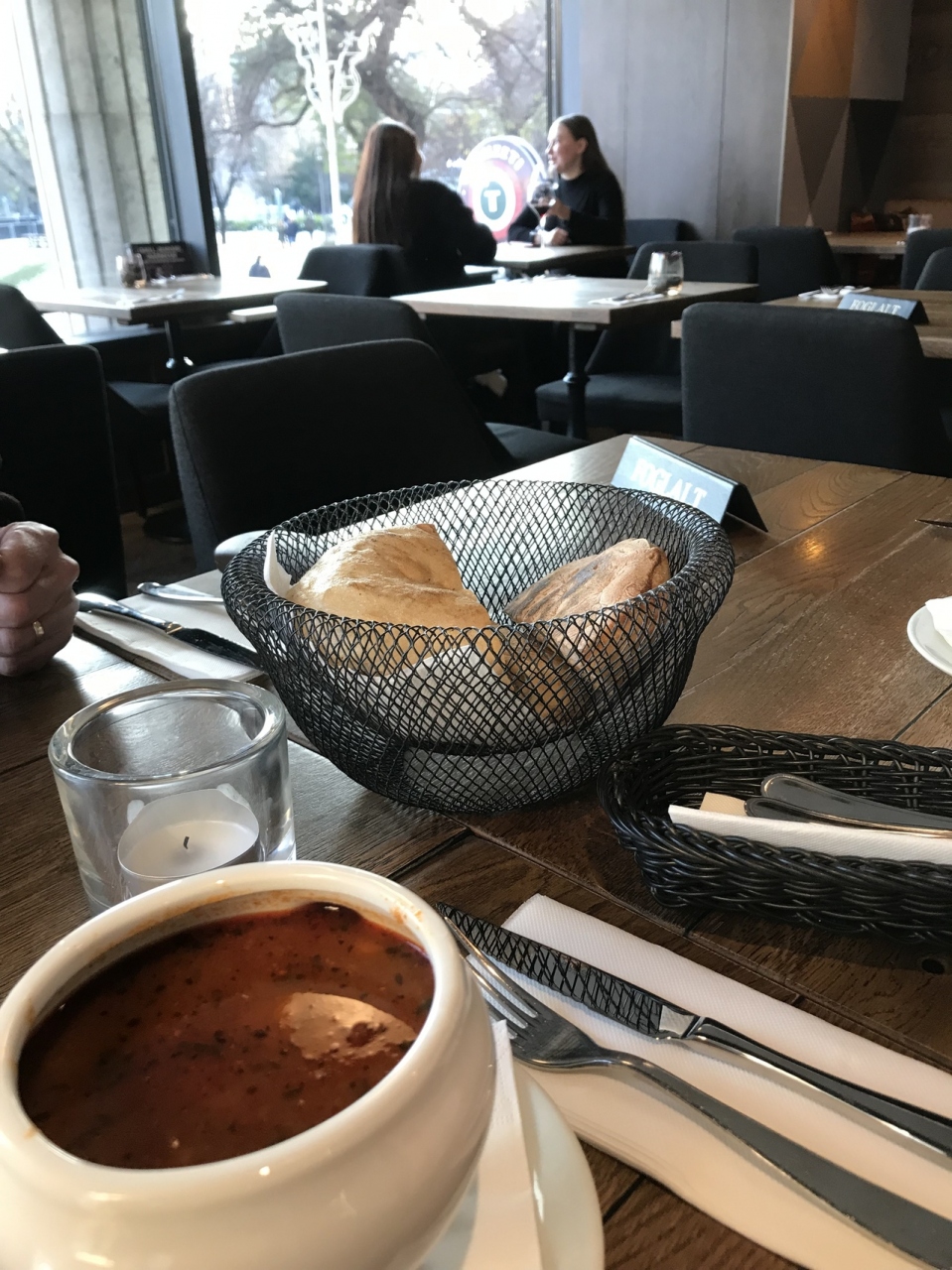 東駅の方にレストランがあるようですが、聖イシュトヴァーン大聖堂に近いこちらはユニークな内装のカフェ・バーな感じです。なんといっても観光地にあり、二階にある大きな窓からエルジェーベト広場の景色を見られ、観光客にとっては使い勝手が良さそうです。食事もお手軽な物から飲み物だけまで堅苦しくない感じでした。料理はバルカン料理の他にハンガリーの伝統的な料理も出していました。味は良かったです。