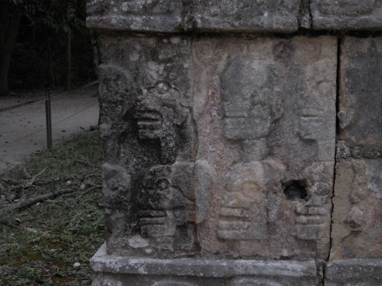 団体ツアーでチチェン・イッツァーを訪れました。中心の広場には巨大なピラミッドや球戯場があります。その片隅に小さな石の構造物があります。近づいてみると側面にはびっしりと骸骨のレリーフが施されており、異様な感じ化します。メキシコシティの方のアステカ文明などとの関係も考察されている骸骨遺跡です。