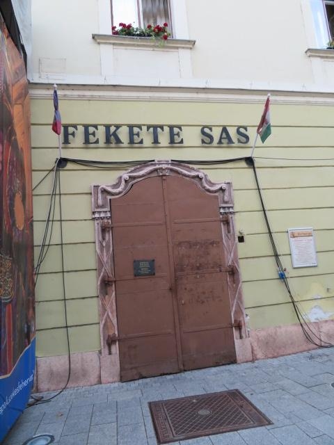 お昼間に行ったにも関わらず閉まってました。古い薬ツボが並んでいるということで楽しみにしていたのに残念です。壁は白と黄緑のツートンカラーで、正面の扉は薬局らしい雰囲気です。正面にイシュトバーンらしきのぼりがあり、こちらはイシュトバーン王ゆかりの薬局なのでしょうね。