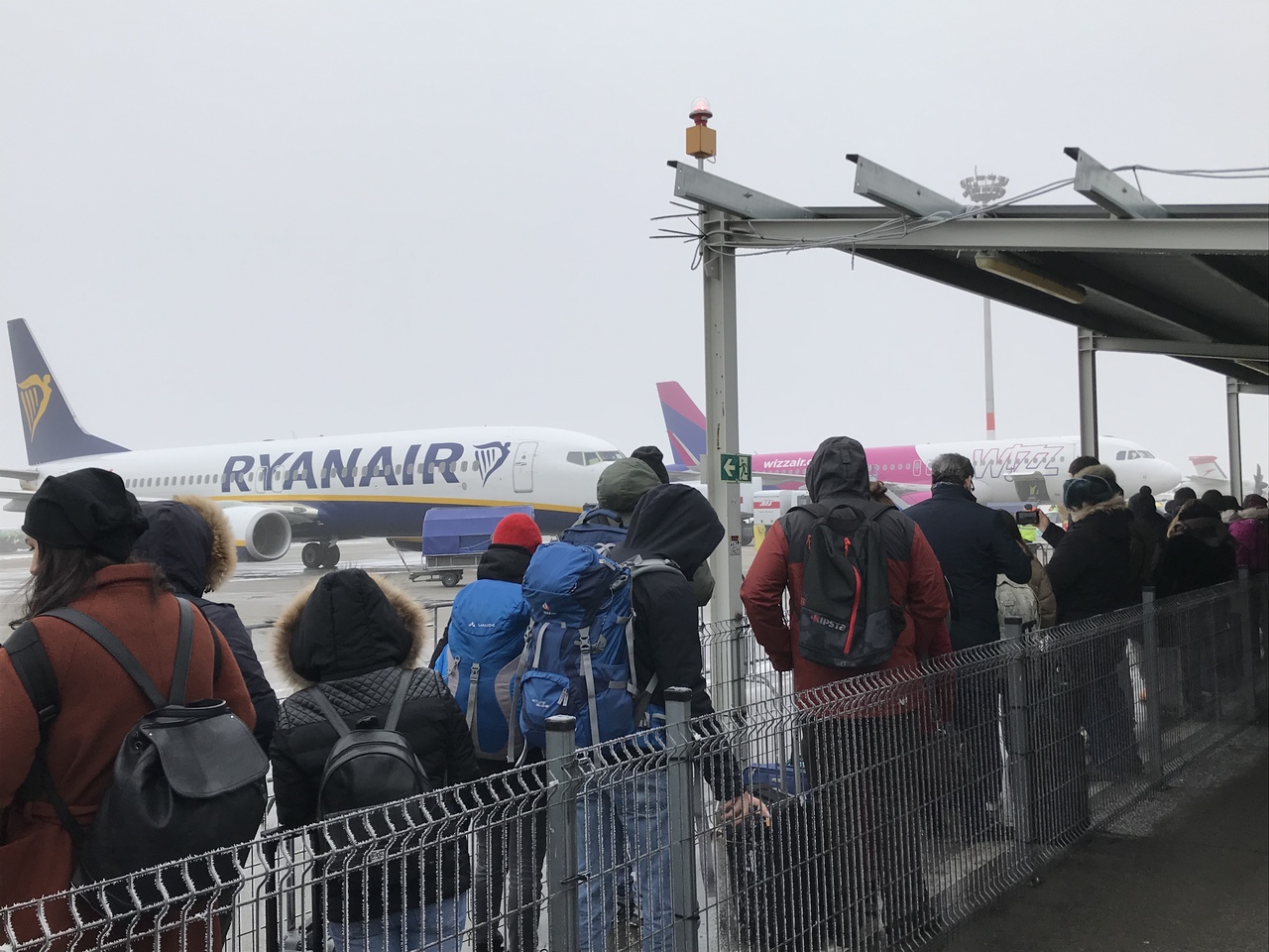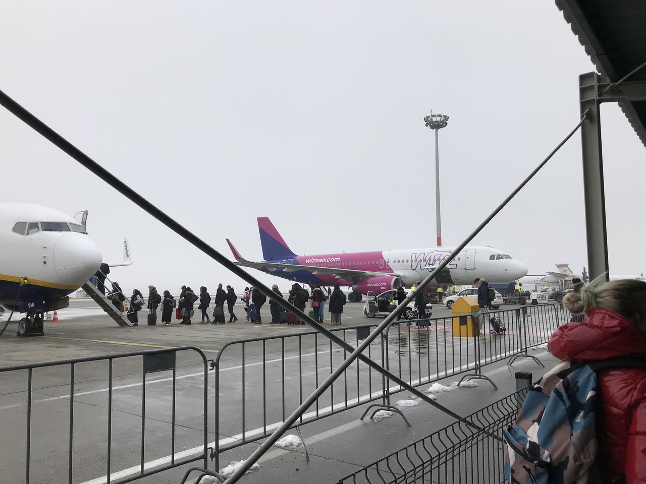 LCCを利用しましたら、体育館のようなところで立って待つ→階段を降りて外。外で飛行機が到着し、乗客を降ろしてから搭乗という、マイナス2度の寒空のもと、大変寒かったです。