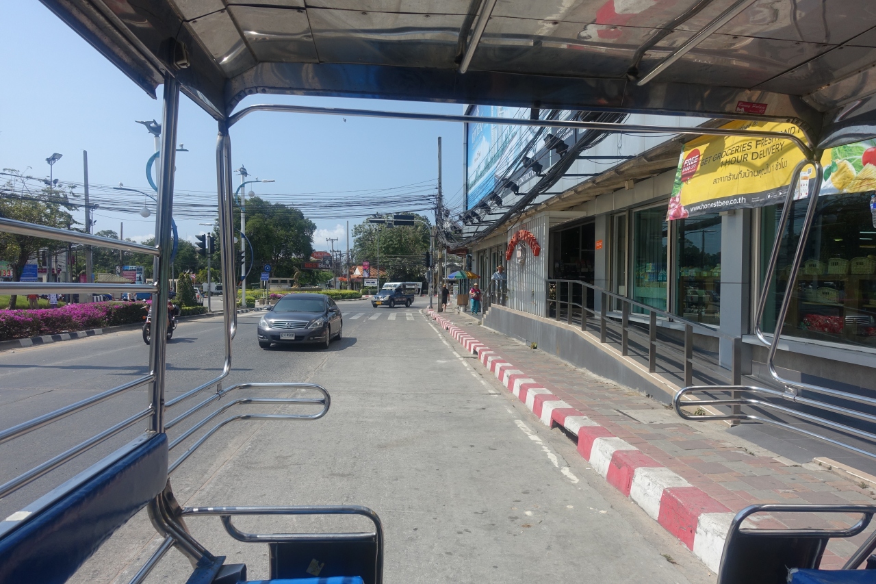 パタヤからバンコクへ移動する際に、セカンドロード沿いのホテル前から乗車→ドルフィンサークルで乗りかえ→ノースパタヤロード→北バスターミナル と移動しました。北バスターミナル方面へ向かうソンテウは、ノースパタヤロードに面したベストスーパーマーケット前に停車していて、ある程度乗客が集まると発車します。