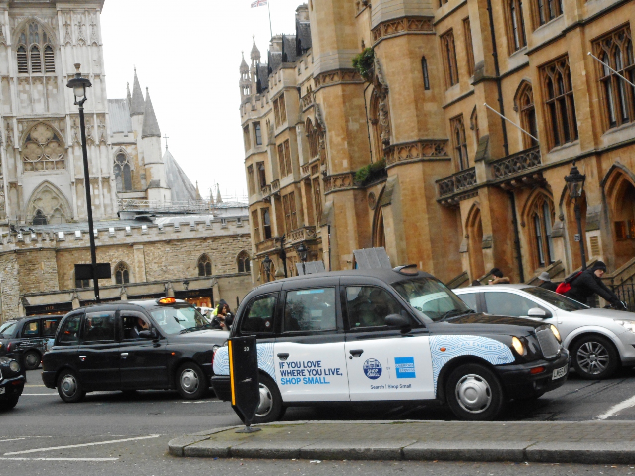 ロンドンのタクシーのブラックキャツプの免許を取得するのには、相当、難しいと聞いていますので、運転手さんはロンドン中の地図が頭に入っていて、どこでも行ってくれます。安心ですし、渋滞している時は時間もかかりますが、街歩きの観光と思えば苦になりません。