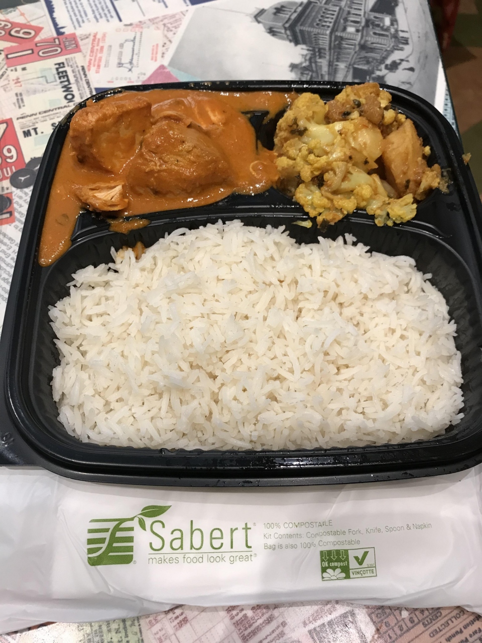 カレーはそれほど辛くないがスパイスが効いて美味しい(飲みもの無しでもOKな辛さ)。カリフラワーもいい塩梅にカレーが効いている。ただしライスはアメリカサイズなので結構なボリューム。