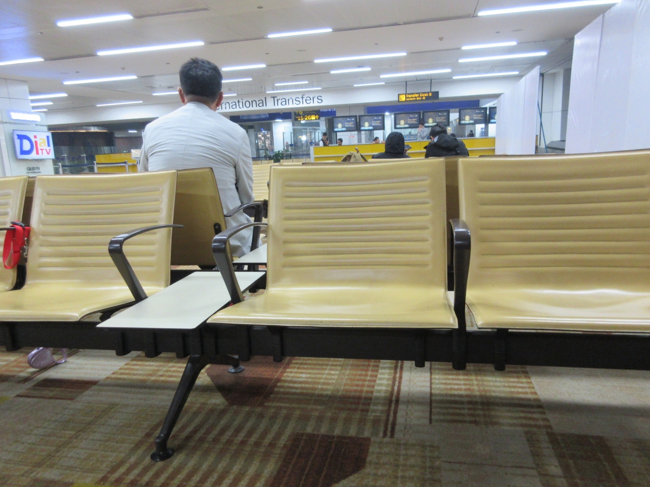 私の飛行機は深夜0時過ぎにDELに到着し、乗継便はその日の8時過ぎでした。ビザ代やホテル代が勿体なかった私は、当然、空港で過ごしました。但し、乗継便の搭乗券はすぐには出してもらえず(午前7時過ぎに、やっと出してもらえました。)、搭乗券がないとセキュリティチェックを通過出来ないので、セキュリティチェック前の待合スペース(写真)で過ごさないといけませんでした。