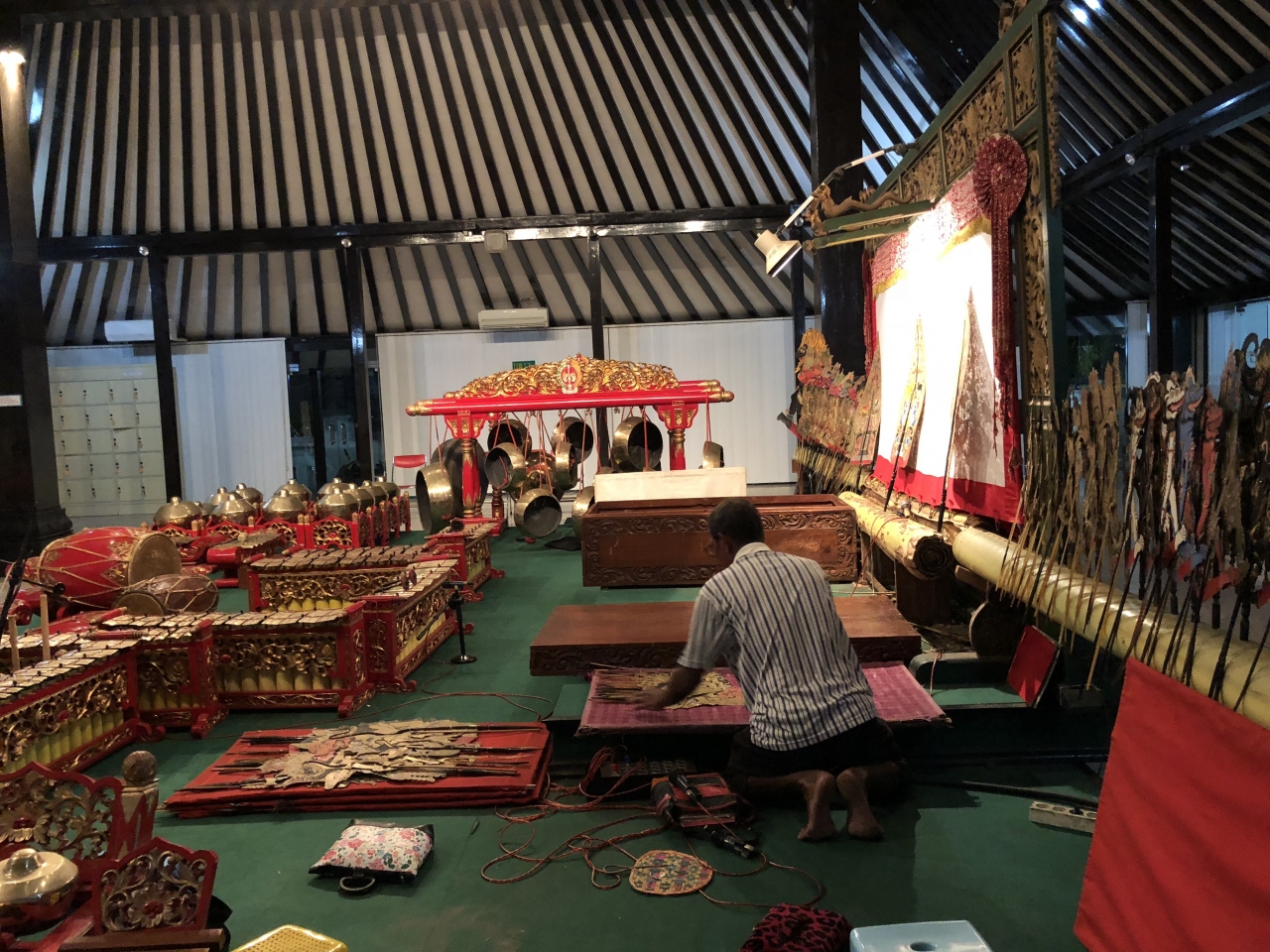 ジャワの伝統芸能ワヤンクリ(影絵)を観ることができます。混むのでは無いかと早めに到着し、20時の開演を待ちました。しかし日本人が数名と欧州の人たちという、お客さんは少なめでした。ワヤンクリが始まりましたが、そもそも言葉が理解できない、話の内容もわからない、ということで、お客さんはどんどん帰って行ってしまい、私もなんとか最後まで残っていましたが、最後に会場が明るくなったときに残っていたのはほんの数名でした。