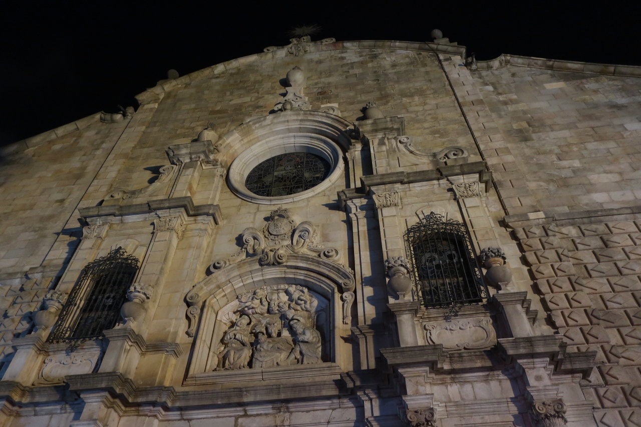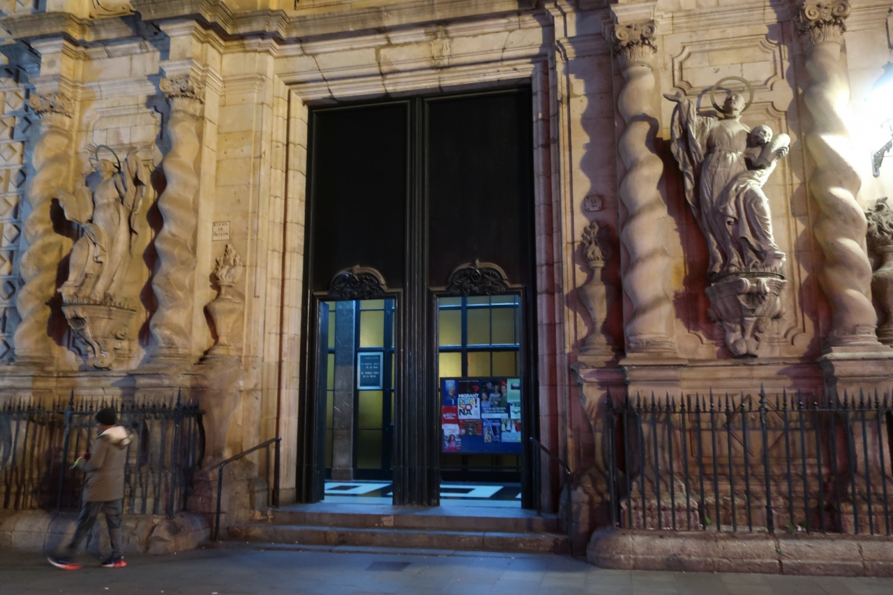 バルセロナの中で最もにぎわっている通り、ランブラス通り沿いにありました。夜散策をしていたところ、突然現れました!。ショップやレストランが並んでいる中、突然雰囲気がガラッと変わります!。教会の周りは静かな空気が流れている感じでした。元日だったので、特に静かだったのかもしれませんね♪。