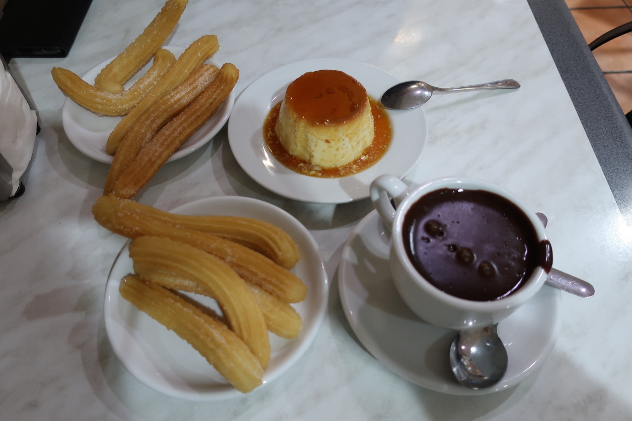 朝食時に伺いました。オープン前に到着しましたが、もう列ができていました。ただ、店内は結構広いのでオープンと同時に並んでいた人たちは着席できます♪。チュロスとホットチョコレート、プリンをオーダーしました。チュロスは美味しいのですが、ホットチョコレートが、、、普通です。甘くないです。こちらのカフェは生クリームがてんこ盛りで有名ですが、私は今回はやめておきました。周りを見ると本当にてんこ盛りの生クリームで、ちょっぴりオーダーしなかったことを後悔しました。プリンはかためで美味しいですよ♪。こちらのお店のはペトリチュアル通りにあり、いくつかのチュロス、スイーツ屋さんが並んでいましたよ!。