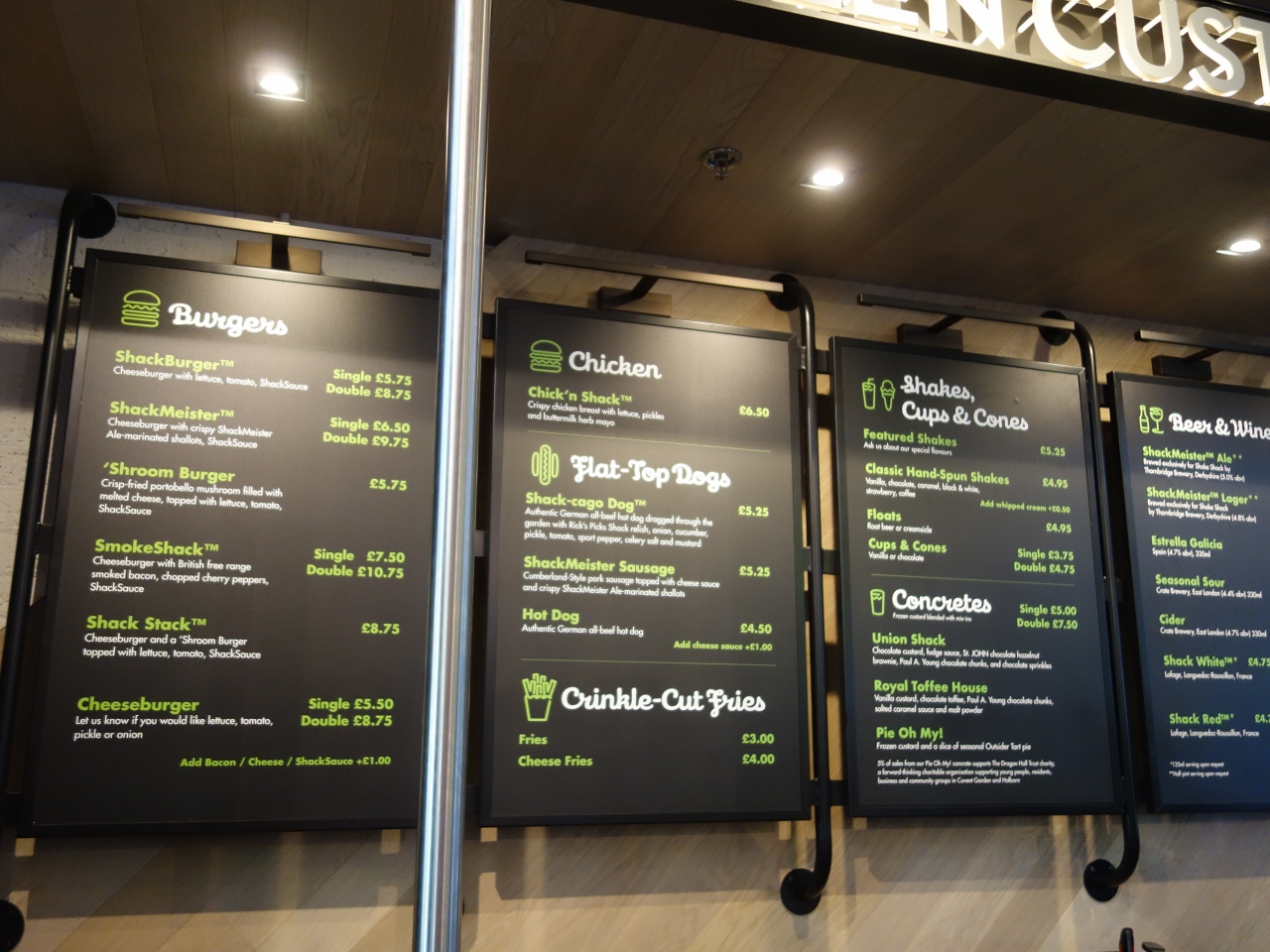 どこのシェイク・シャックも似たようなものですが,ここも,注文するところと,出来たのをもらうところが離れています。注文してから,一度廊下に出て,別の部屋の入口で待ったいて,番号が呼ばれたら部屋に入っていって,品物を受け取ります。ちょって面倒ですね。味は,。。。ニュー・ヨークで食べた時ほどは感動しませんでした。まあ,ふつうのおいしさです。