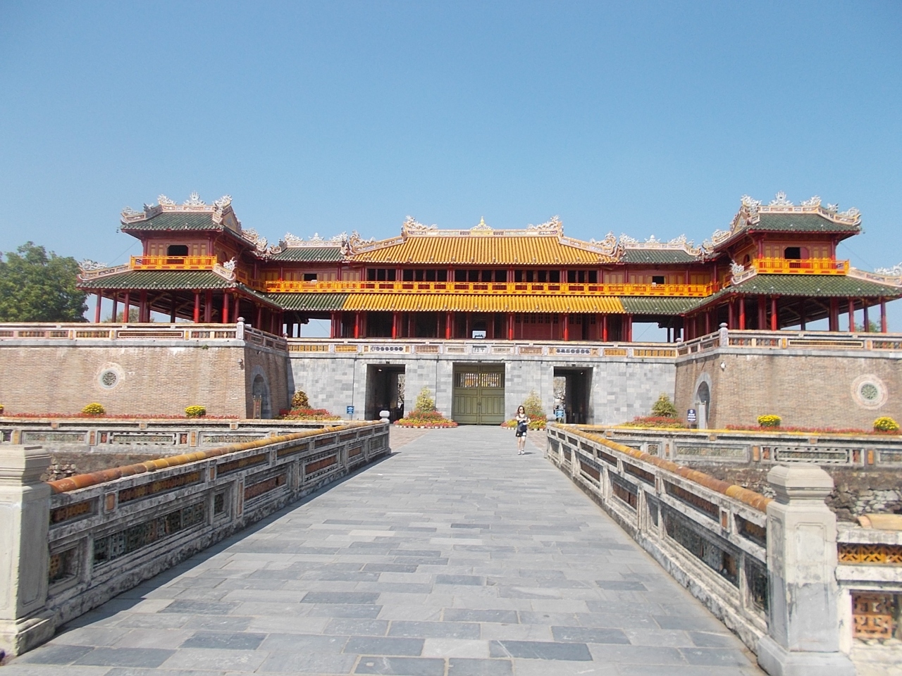 この王宮門 (午門) はフエ王宮の南側の門です。石づくりの基礎に中国風の2階建ての建物がたっています。午門というのは紫禁城の午門を模倣したからだといわれています。この門の中央の出入口は皇帝が使用してのです。それ以外は左右の小さな門を使用したのです。門を入ると正殿が見れます。